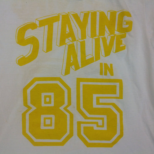 Vintage 1980's Novelty T-Shirt STAYING ALIVE IN 85 Yellow on White Katharine Hamnett