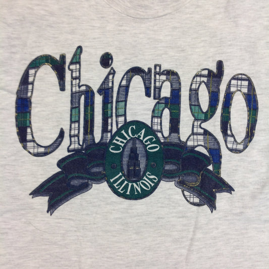 Vintage 1990's Hanes Beefy-T Souvenir Gray Men's Medium Short Sleeve Blue-Green Plaid Chicago Illinois