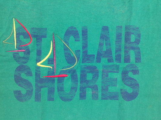 Vintage 1990's Fruit of the Loom Adult Large Souvenir T-Shirt Teal Blue Big Letter Abstract Sailboats St Clair Shores Michigan