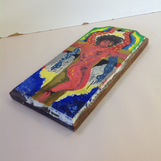 Vintage 1992 Folk Art Surruralism Gouache Painting on Wood "Icon" Retlaw