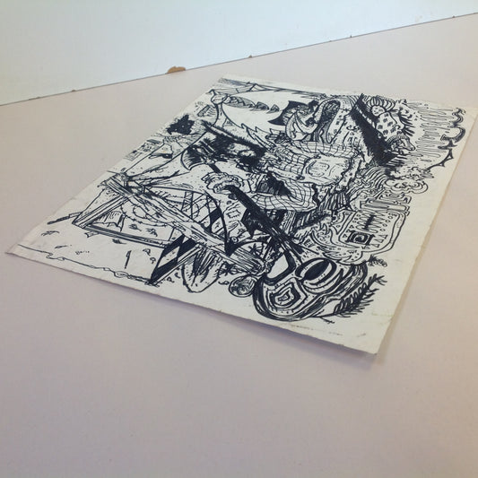 Vintage 1992 Folk Art Surruralism Ink Drawing on Paper "Midwest Kitchen Floor" Retlaw