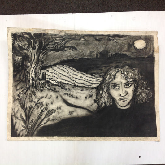Vintage 1992 Folk Art Surruralism Charcoal Drawing on Paper "Yr. Grave" Retlaw