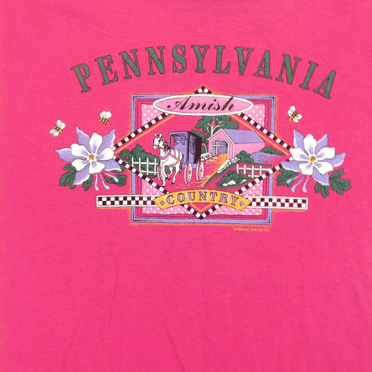 Vintage 1996 Wild West Shirt Co Souvenir Hot Pink Large T-Shirt Pennsylvania Amish Country Covered Bridge Horse and Buggy