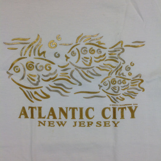Vintage 1997 Anvil F&M Expressions Souvenir White Medium Cotton Short Sleeve Souvenir Atlantic City New Jersey Gold Silver Minimalist Fish