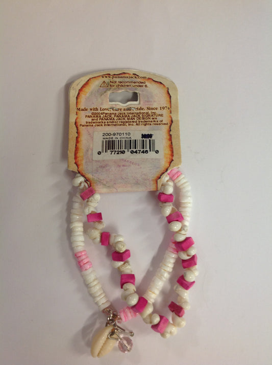 Vintage Authentic Panama Jack Duo Ankle Bracelet in Pink and White Beads with Shell and Pink Rhinestone Pendant