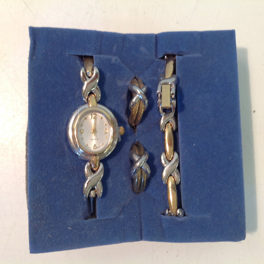 2004 NOS AVON Women's Two-Tone X-Link Watch Bracelet and Clip Earring Set w/Box