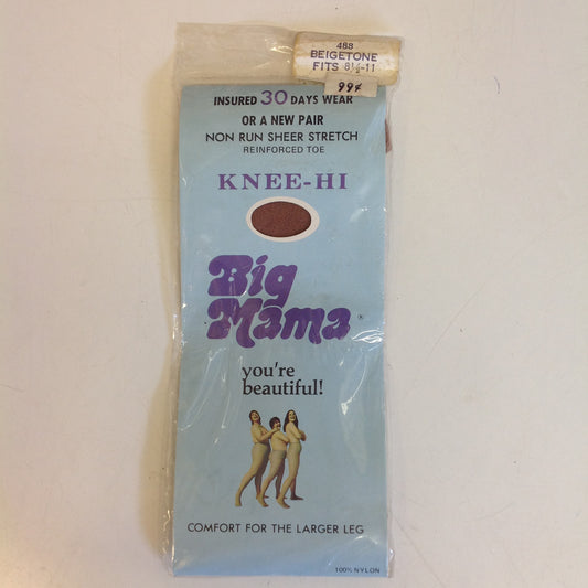 Vintage NOS 1960's BIG MAMA 100% Nylon Non Run Sheer Stretch Reinforced Toe Knee-Hi 488 Beigetone 8 1/2-11