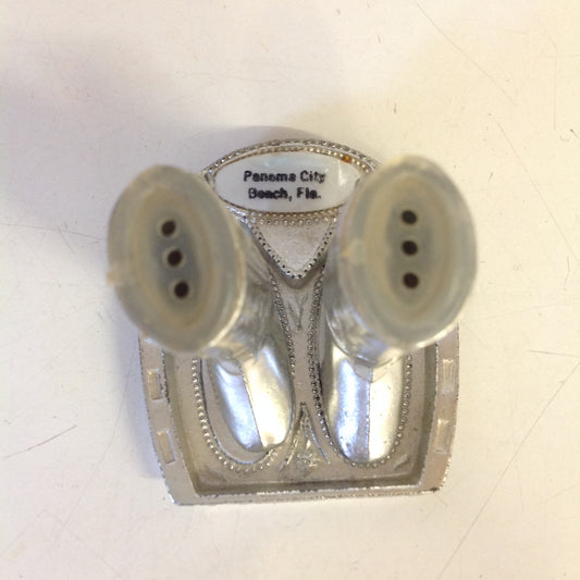 Vintage Souvenir Panama City Beach Florida Silvertone Salt and Pepper Shaker Set with Stand