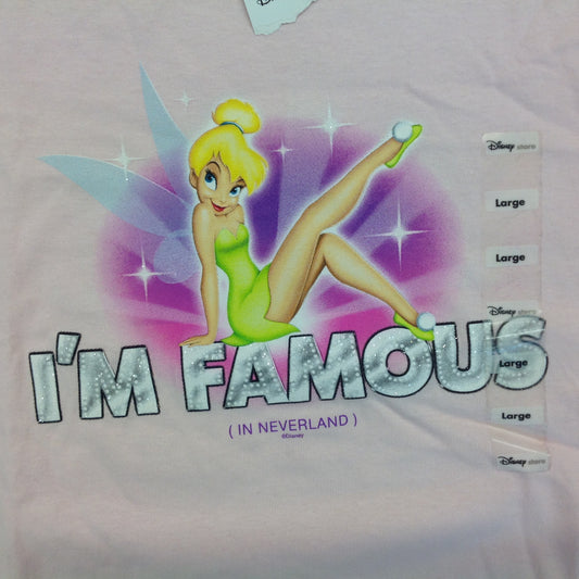 Large Disney Store Pink T-Shirt Glittery TinkerBell I'm Famous in Neverland New with Tag