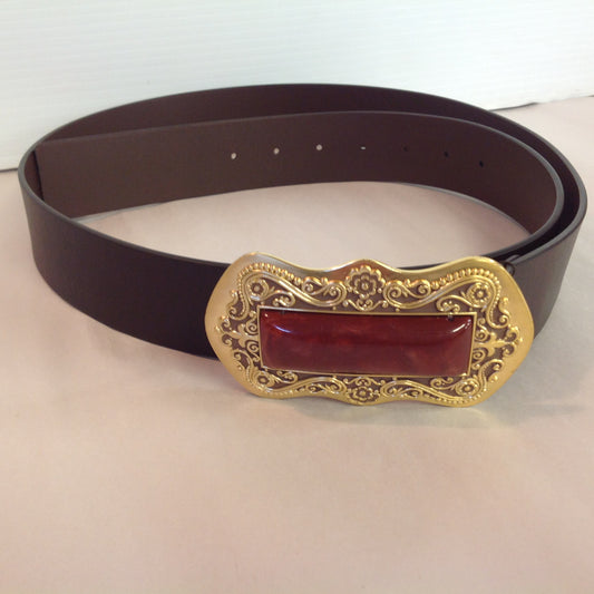 Large Dark Brown Chico's Women's Leather Belt Gold Tone Floral Filigree Marbled Rust Centerpiece Buckle 3