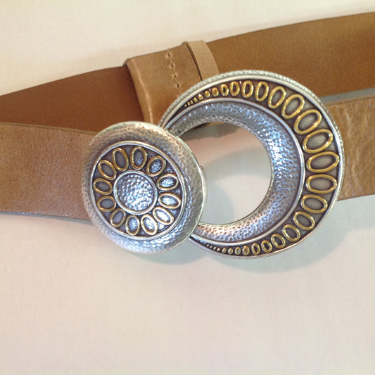 Tan Leather Coldwater Creek Ladies' Belt Silvertone Crescent Filigree and Circle Buckle 2