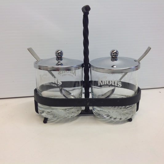Vintage Pair Knott's Berry Farm Jelly Jars w/Silvertone Lids and Serving Spoons in Wrought Iron Holder