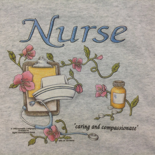 Vintage 1998 Large Gray Sweatshirt Nurse: Caring and Compassionate Floral Message NameMe Calligraphy
