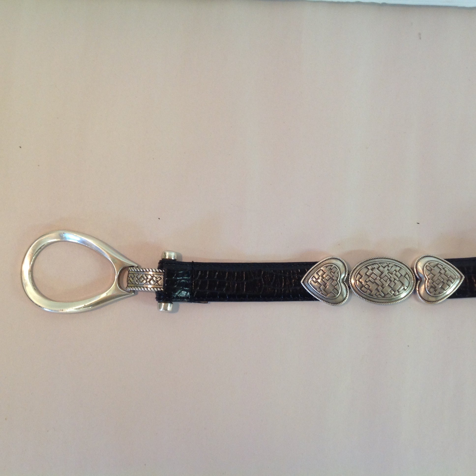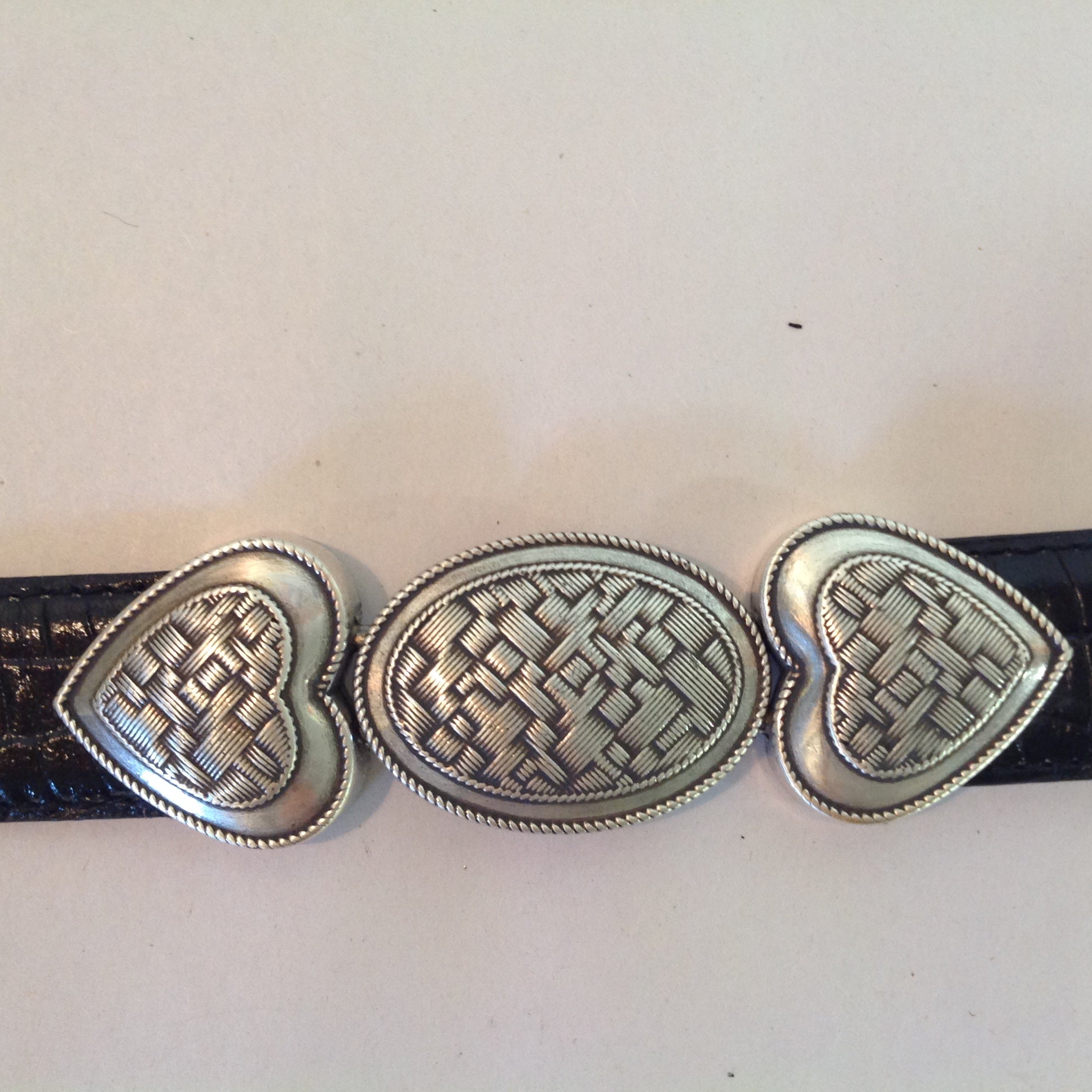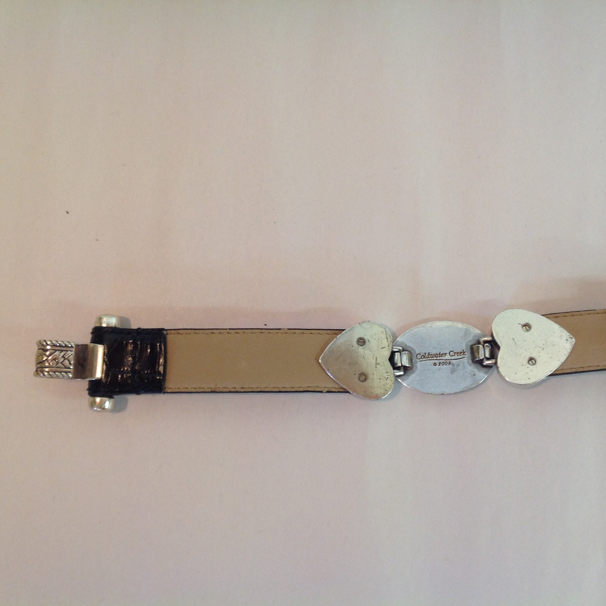 2008 Coldwater Creek Women's L/XL Black Leather Belt Metal Hearts Motif Abstract Geometric Link Hoop Hook Closure 16