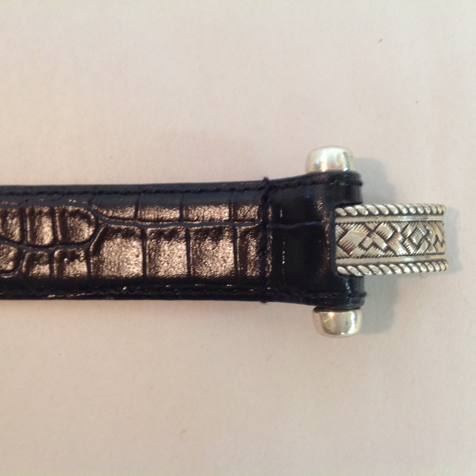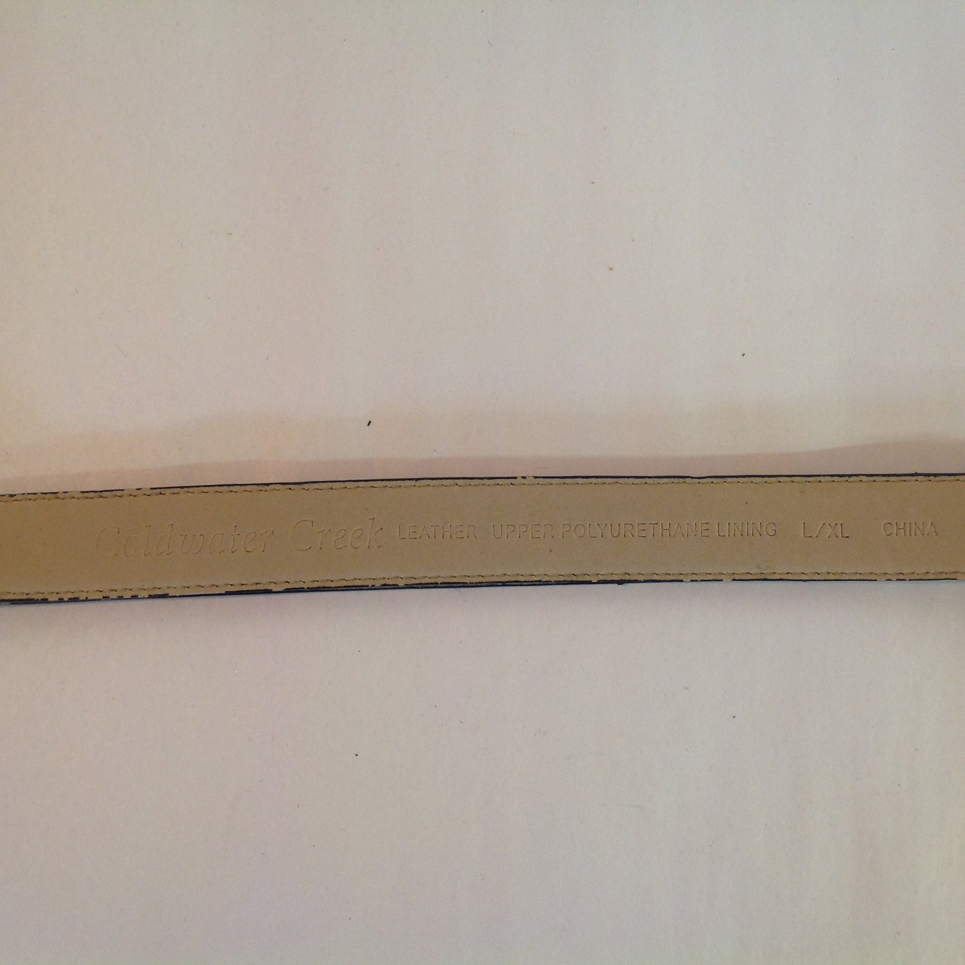 This is a used item, in good used condition, with light signs of wear; there is mild rubbing/scuffing to surface of leather and rear of metal links/hooks. Overall quality is good; soft/supple, clean/smooth, with excellent retention of color/sheen and engraved embellishments still sharp/clear. There are no excessive nicks, chips, dents, divots, scrapes, scratches, scuffs, cracks, breaks, stains, residue or repairs. The belt is stamped as leather, from Coldwater Creek, in a L/XL (large/extra large) and is made in China. The belt measures approx 33" in overall length.