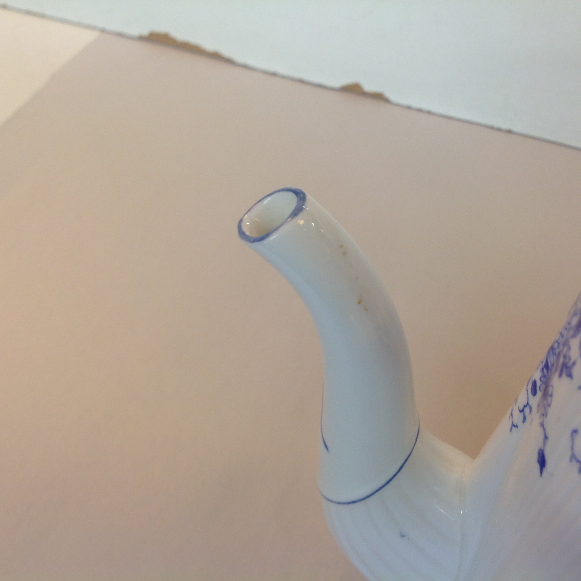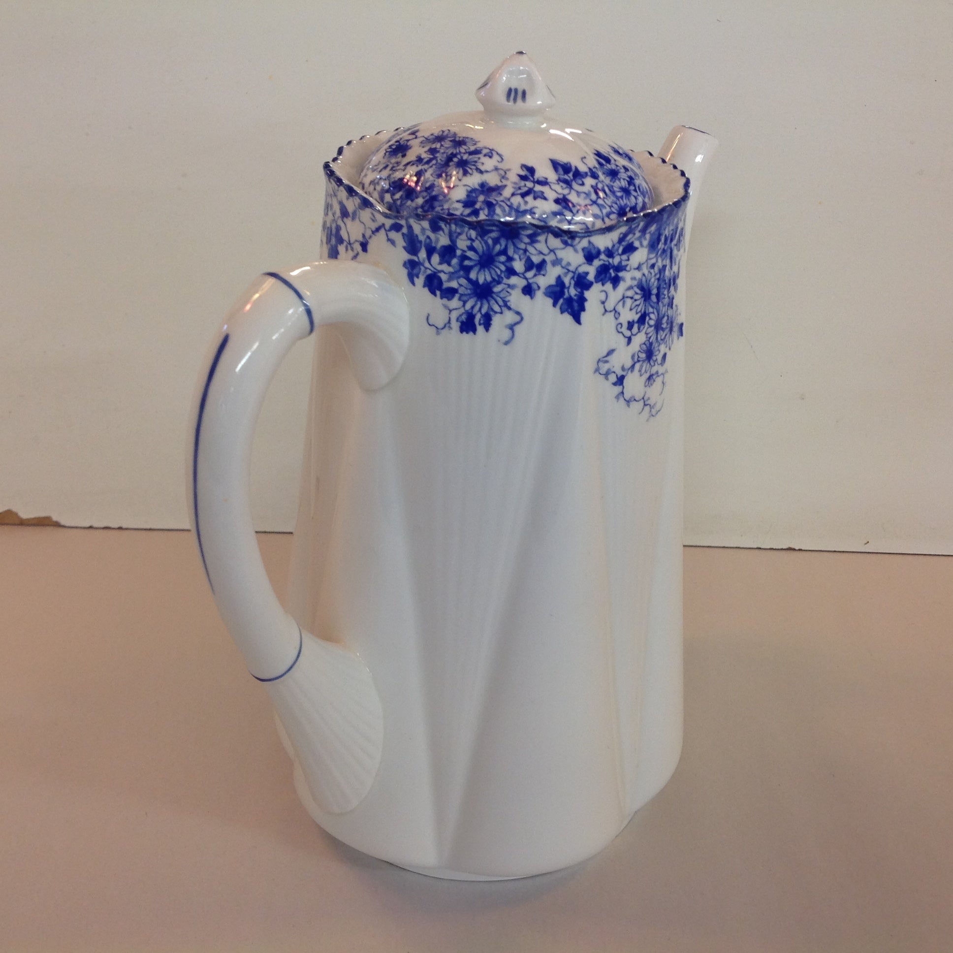 These are antique used items, in good used condition, with little sign of age/wear; there is mild rubbing to surface of porcelain, faint wear along/about base. Overall quality is good; clean, smooth/glossy, with excellent preservation of color/sheen and graphic embellishments still sharp/vivid. There are no excessive nicks, chips, dents, divots, scrapes, scratches, scuffs, cracks, breaks, stains, residue or repairs. The coffee pot measures approx 8.25" x 7.5" (spout-to-handle), with a 3.5" wide mouth and 4" base.