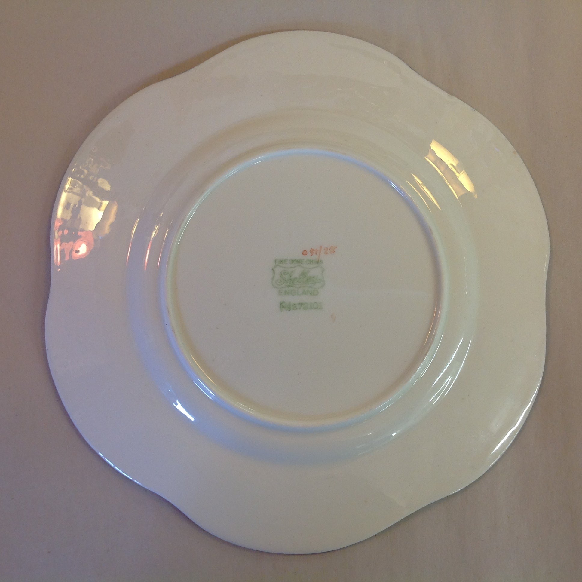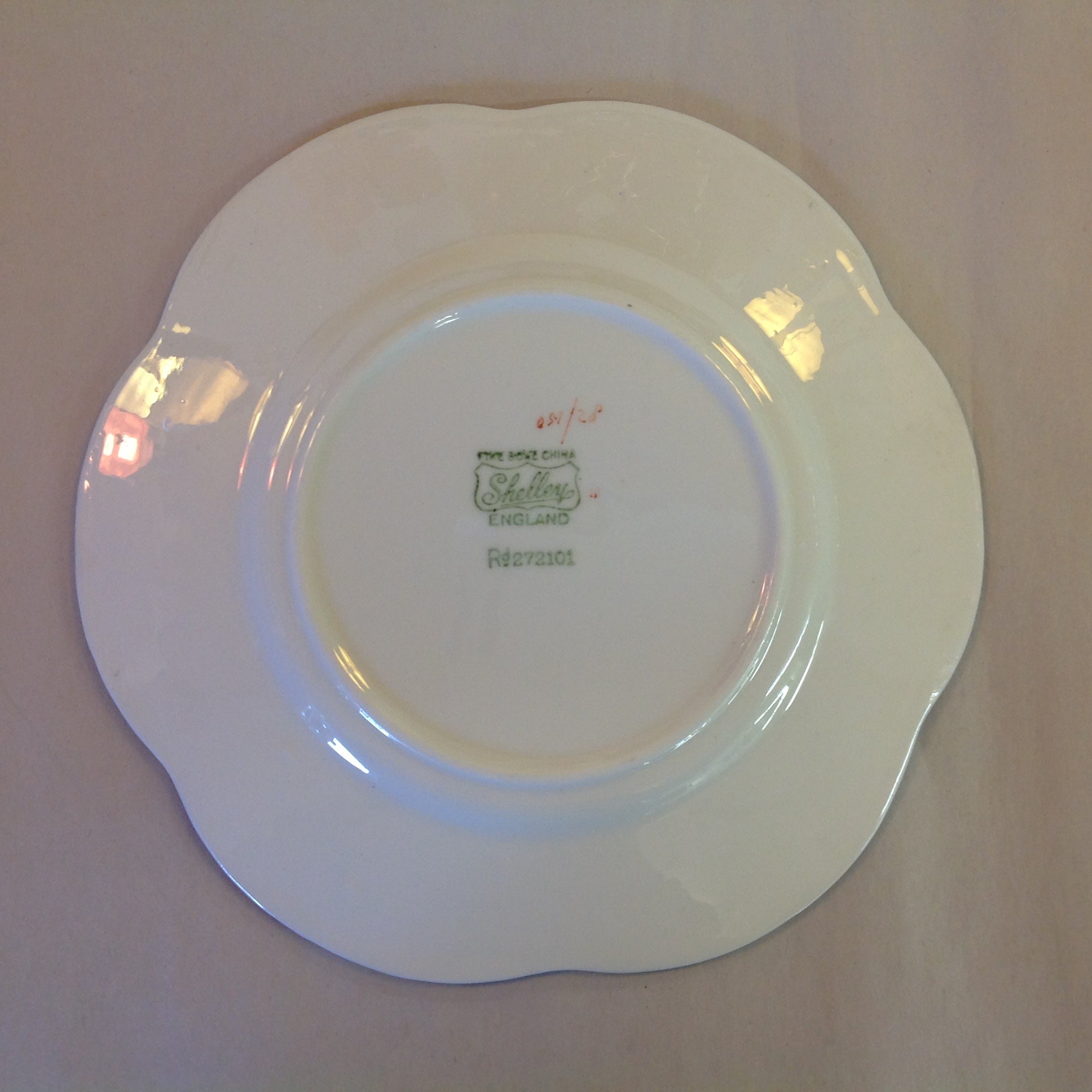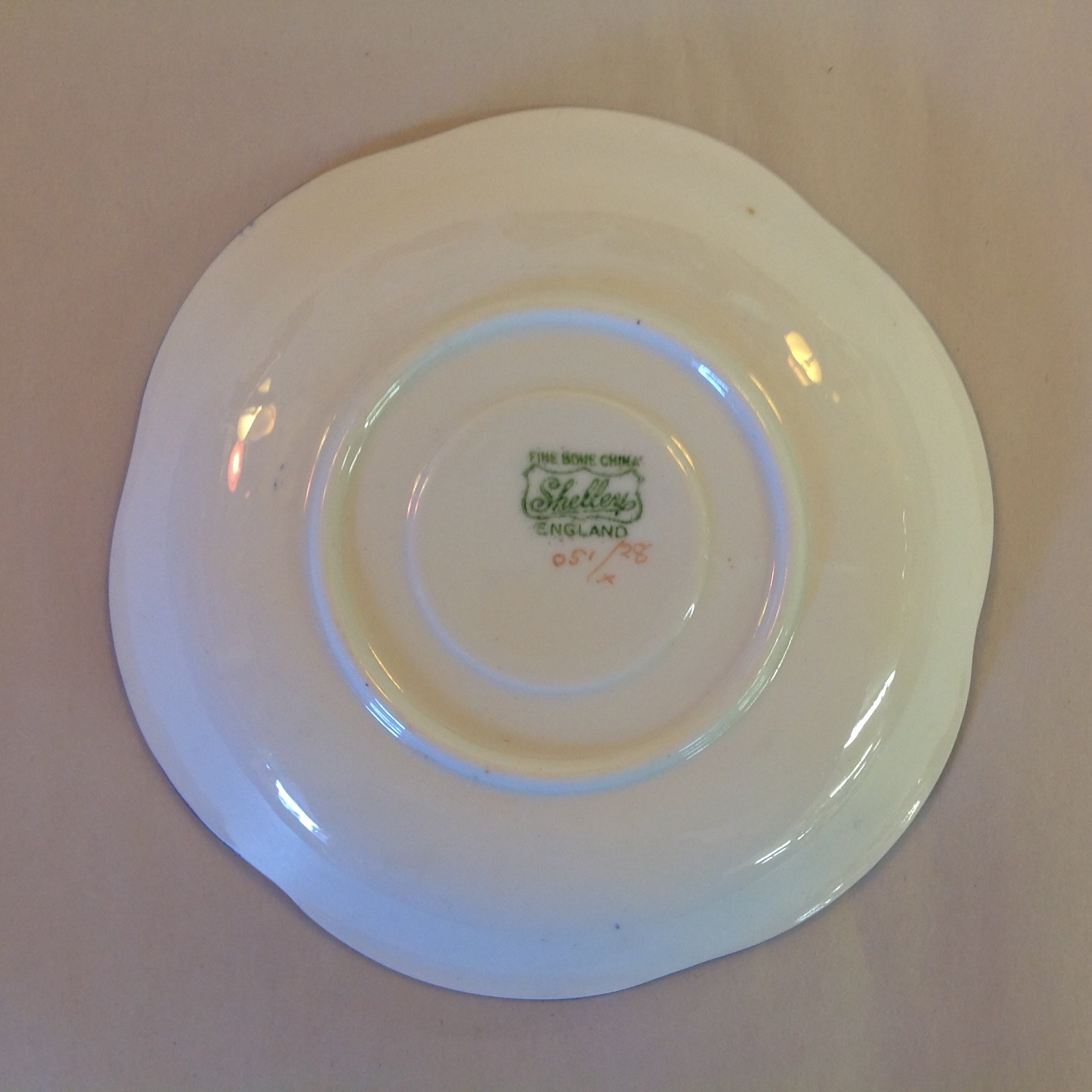 These are antique used items, in good used condition, with little sign of age/wear; there is mild rubbing to surface of porcelain, nominal wear along/about base. Overall quality is good; clean, smooth/glossy, with excellent preservation of color/sheen and graphic embellishments still sharp/vivid. There are no excessive nicks, chips, dents, divots, scrapes, scratches, scuffs, cracks, breaks, stains, residue or repairs. This suite includes: cup (approx 2.5" x 4" [to handle], with 3.5" wide mouth and 1.5" wide base), tea saucer (5.5" wide, with 1" lift and 2.75" wide base), biscuit plate (6" wide, .5" lift, 3" wide base) and bread plate (7.25" wide, .5" lift, 3.75" wide base). Each piece is stamped "Shelley Fine Bone China England."