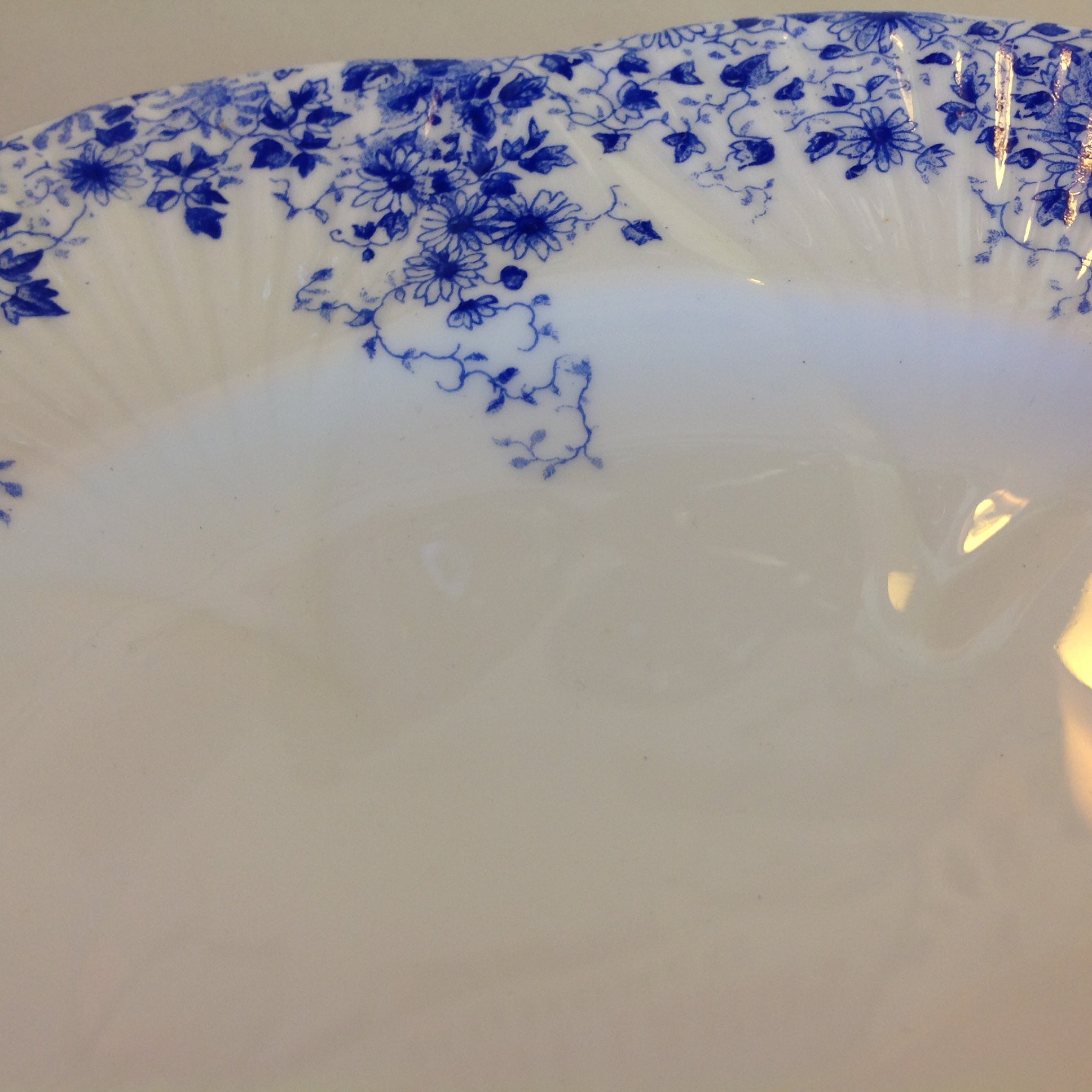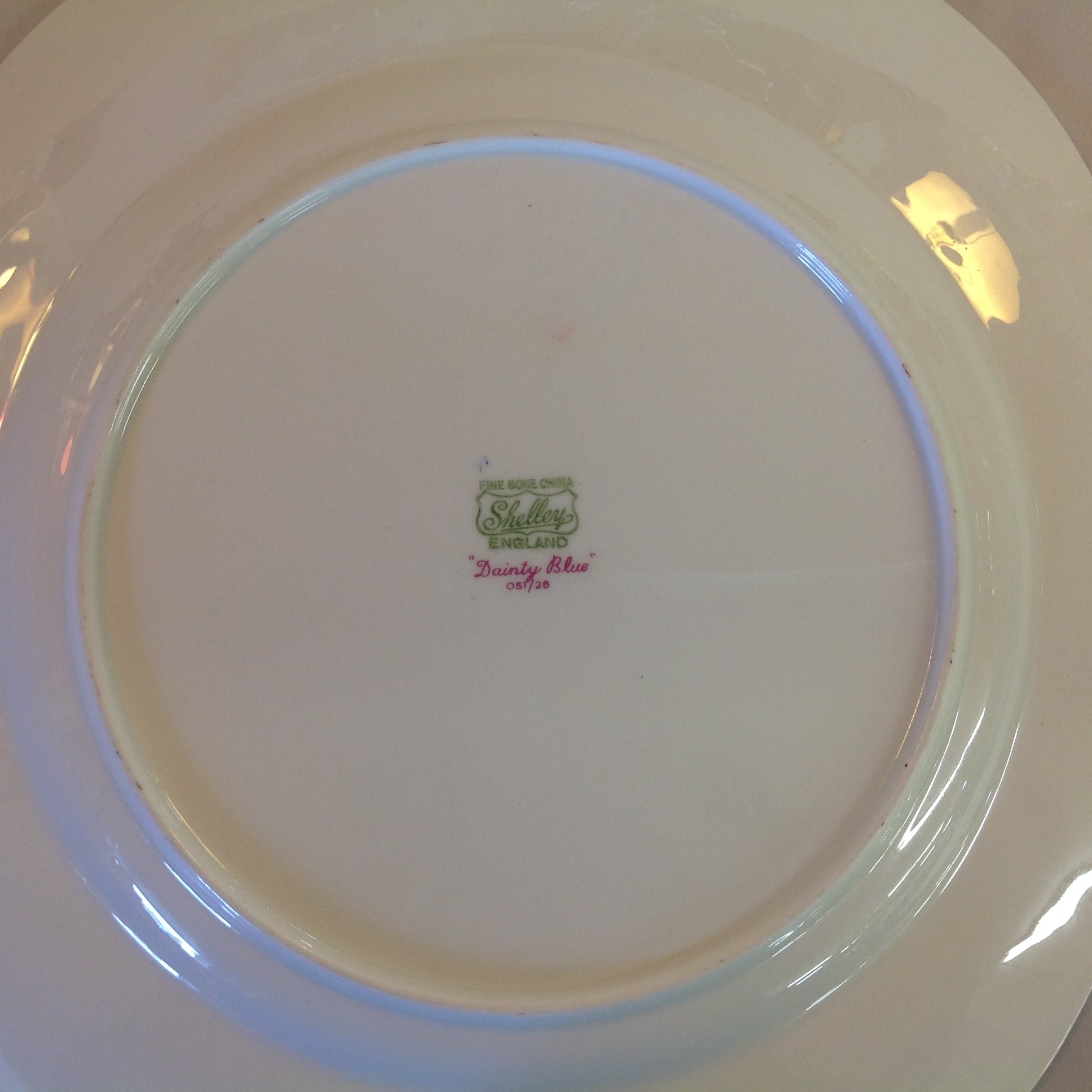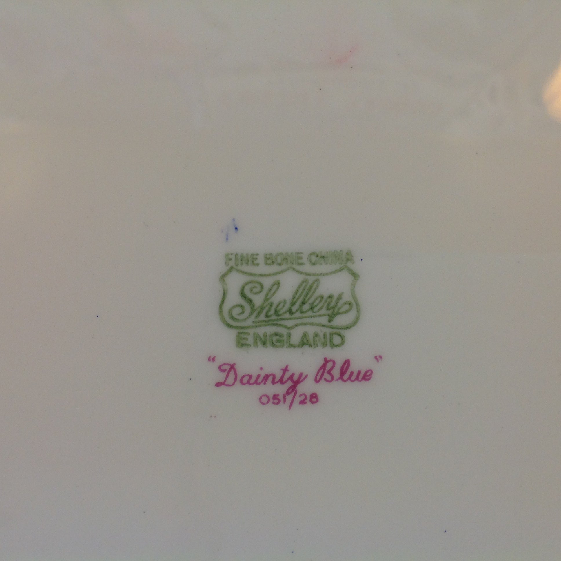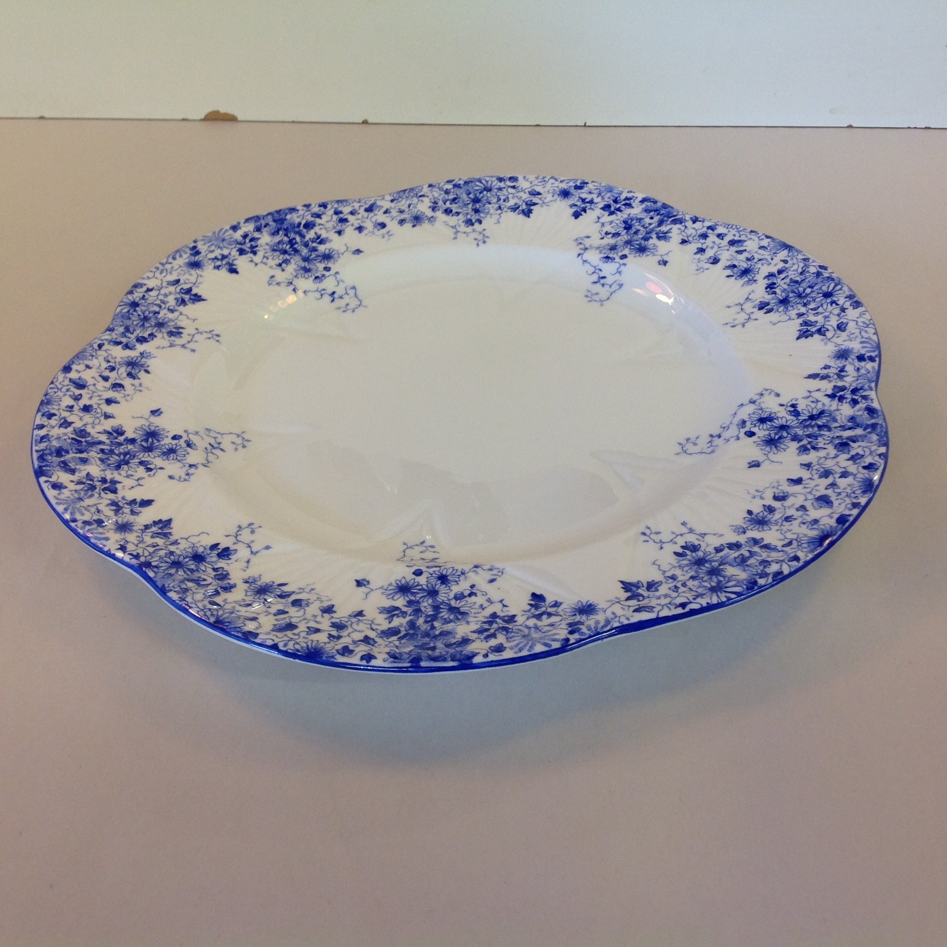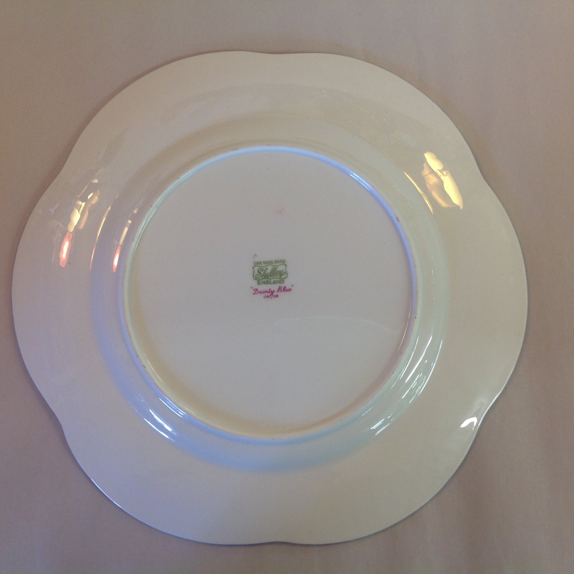 This is an antique used item, in good used condition, with little sign of age/wear; there is faint rubbing to surface of porcelain, faint wear along/about base. Overall quality is good; clean, smooth/glossy, with excellent preservation of color/sheen and graphic embellishment still sharp/vivid. There are no excessive nicks, chips, dents, divots, scrapes, scratches, scuffs, cracks, breaks, stains, residue or repairs. The plate measures approx 10.75" wide, with a 1" lift and 6" base and is stamped "Shelley Fine Bone China England Dainty Blue."