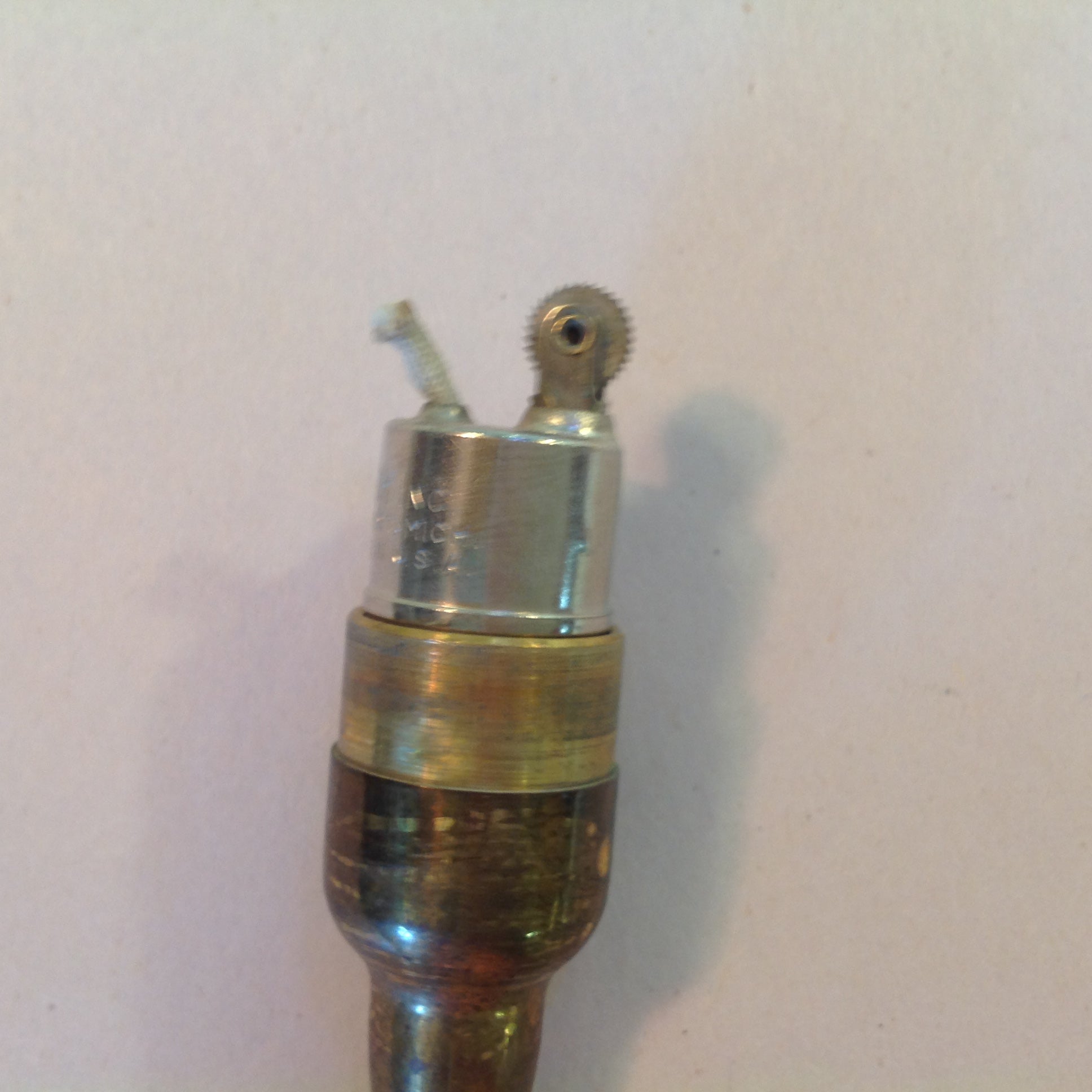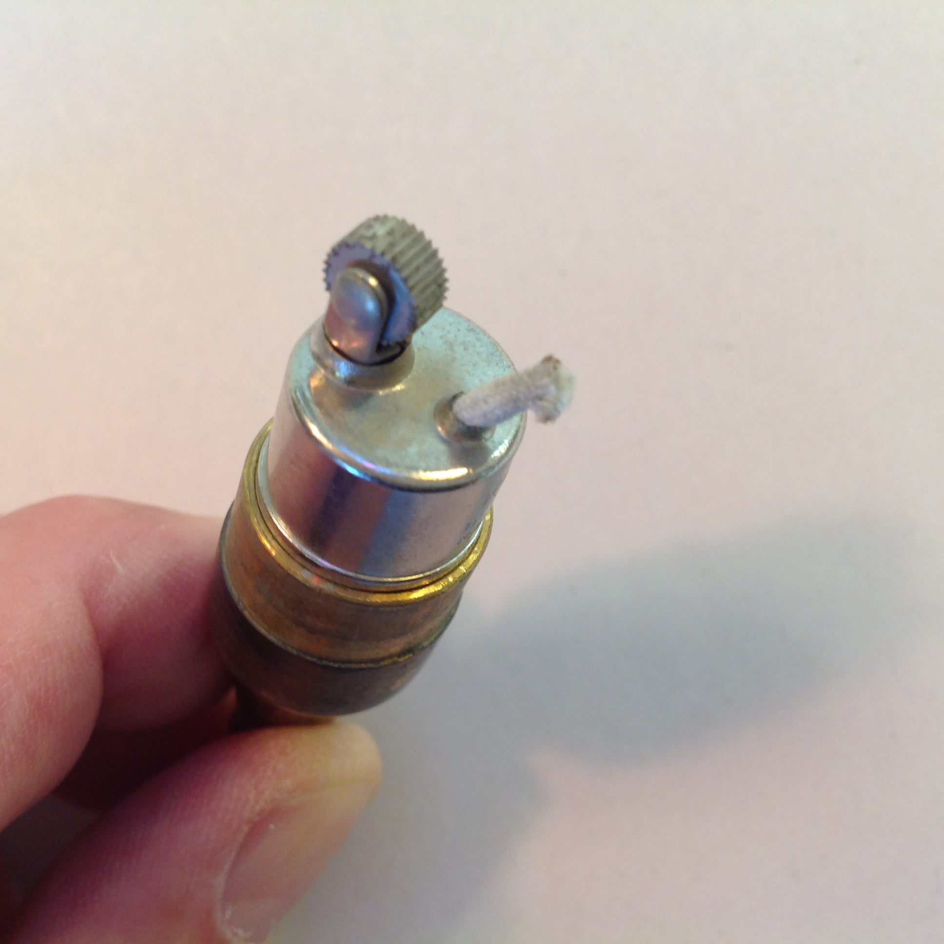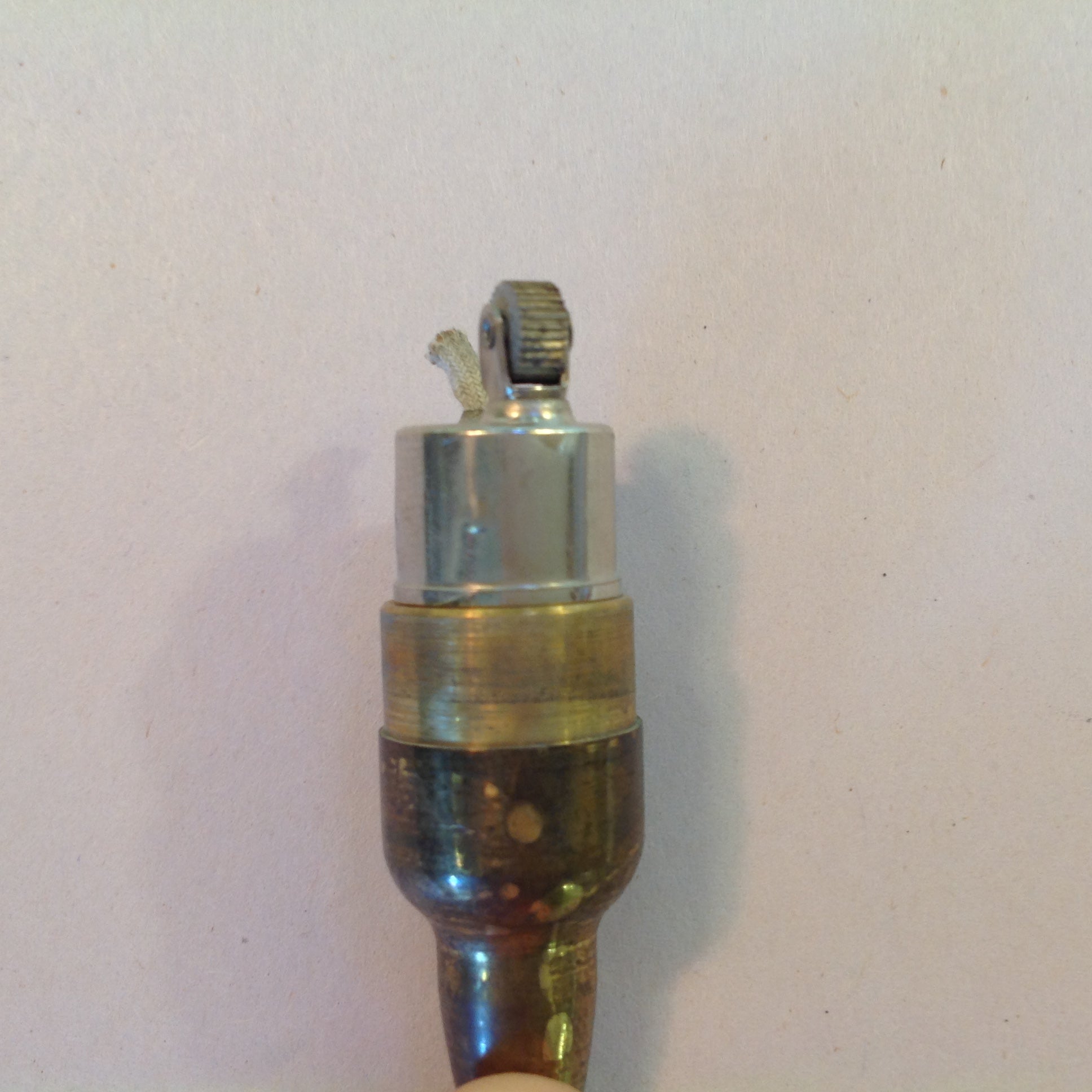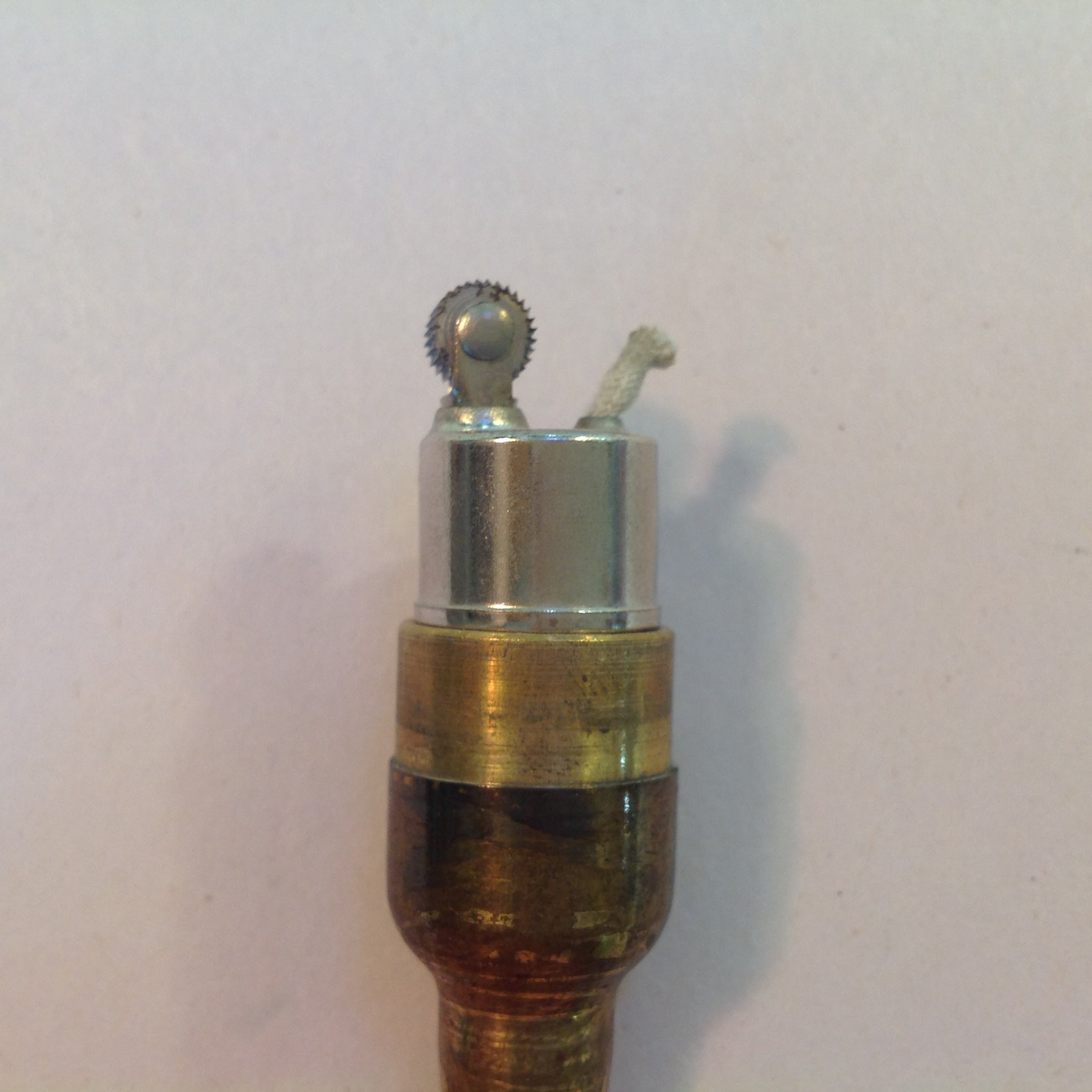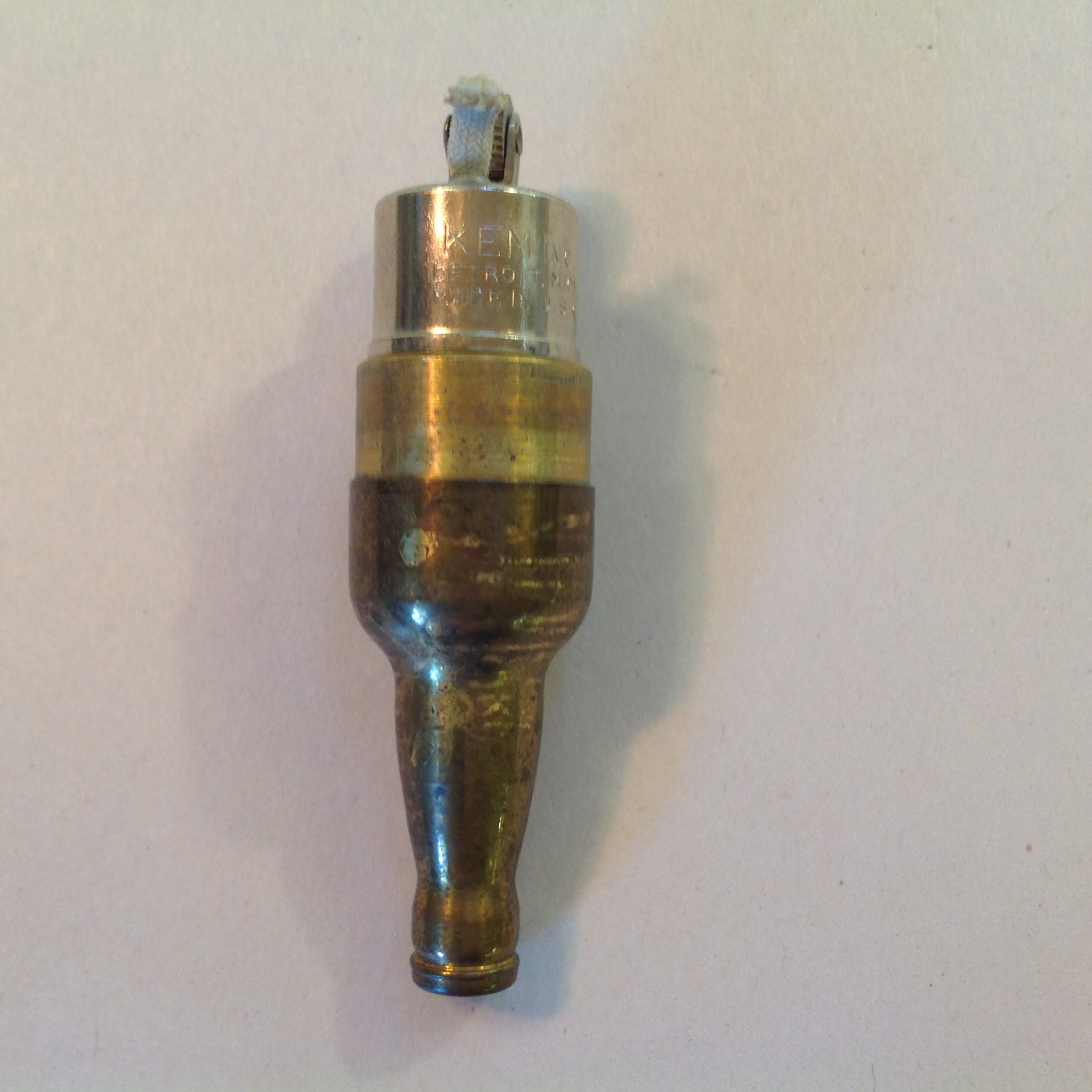 This is a vintage used item, in good used condition, with light signs of age/wear; there is mild rubbing to surface of metal, minor wear to paper decal graphics, light wear along/about base and to interior of base cap. Overall quality is good; clean, smooth/glossy, with excellent preservation of color/sheen and graphics still sharp/clear; appears unused. There are no excessive nicks, chips, dents, divots, scrapes, scratches, scuffs, cracks, breaks, stains, residue or repairs. The lighter measures approx 2.75" x .5".
