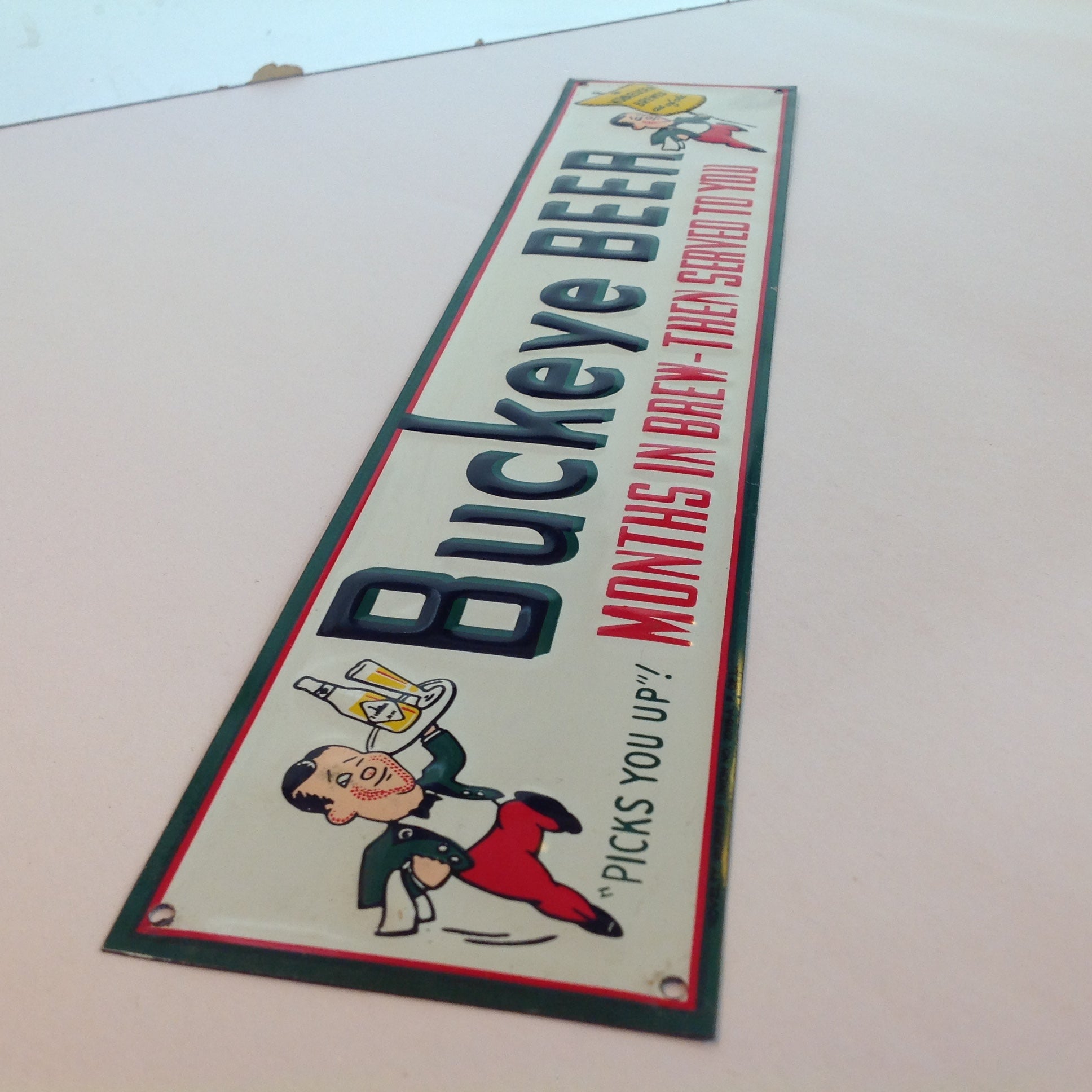 Vintage 1950's-60's Enamel Paint Metal Door Handle Push Plate Sign Buckeye Beer "Picks You Up!"