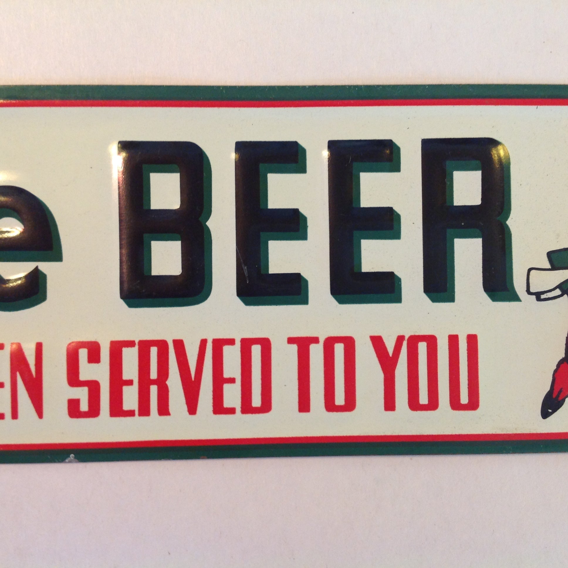 This is a vintage used item, in good used condition, with light signs of age/wear; there is light rubbing to surface of metal, mild edgewear and associated corner wear, light wear at mounting holes, minor points of blemish/distress. Overall quality is good; clean, smooth/glossy, with excellent preservation of color/sheen and graphics still bold/vivid. There are no excessive nicks, chips, dents, divots, scrapes, scratches, scuffs, cracks, breaks, stains, residue or repairs. The sign measures approx 13.5" x 2.75".