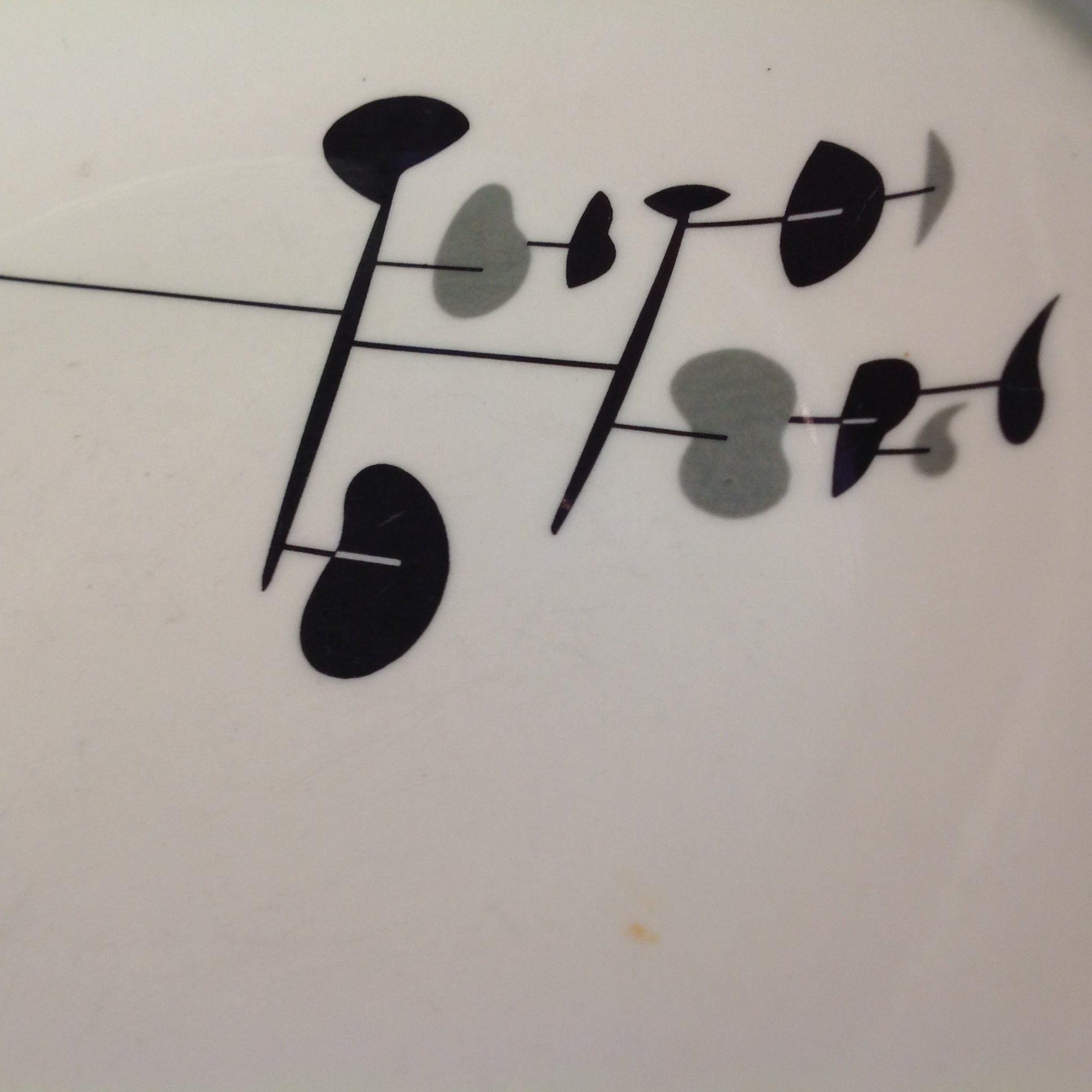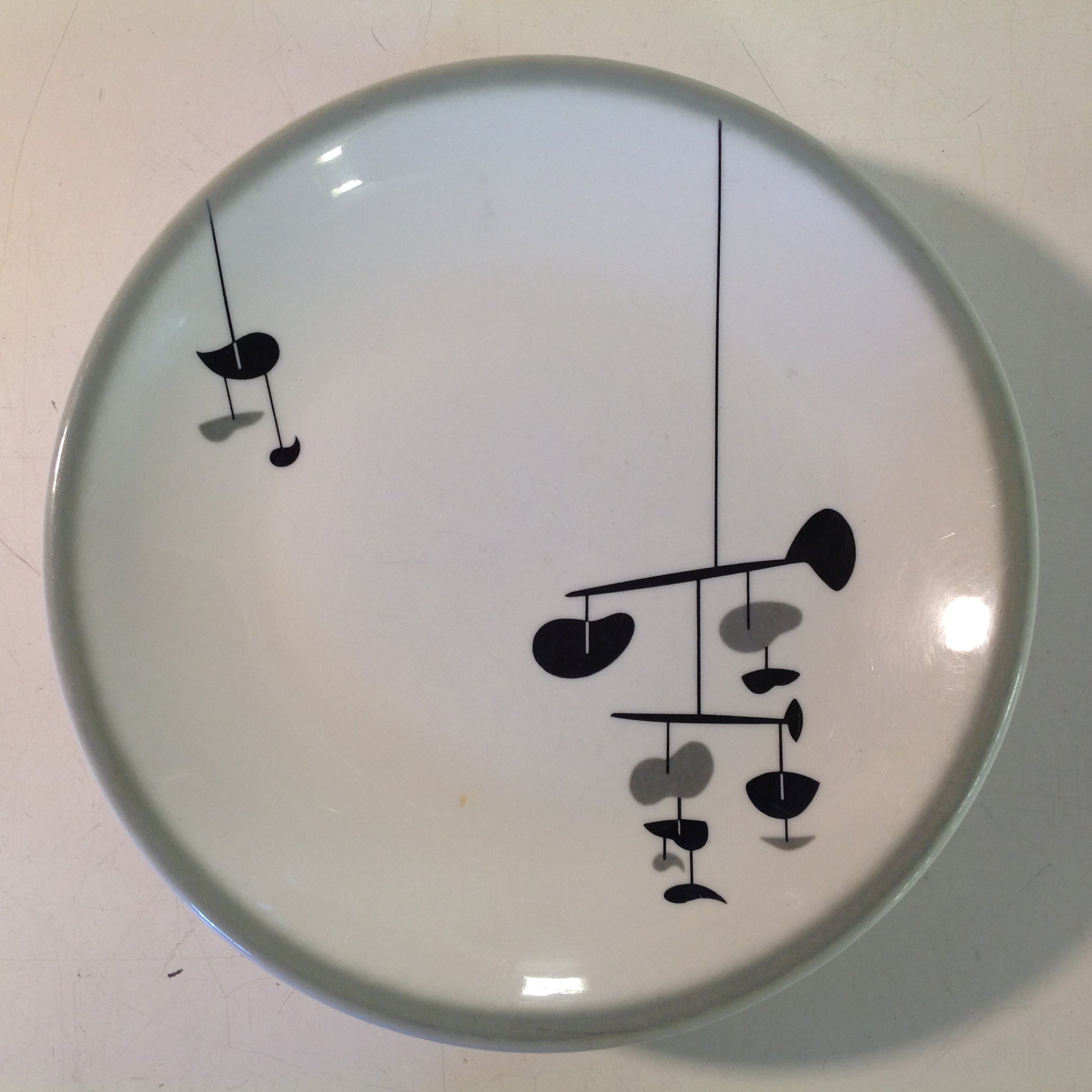 Here is a vintage dishware set from Shenango China in a mobile pattern, evoking the sculptural work of Alex Calder. These are vintage used items, in good used condition, with light signs of age/wear; there is minor rubbing and scoring to surface of plates, small points of discoloration. Overall porcelain quality is good, smooth/glossy, with excellent preservation of images. There are no excessive nicks, chips, cracks, breaks, stains, residue or repairs. The dishware is available as single plate ($30) or set of 4 ($120).