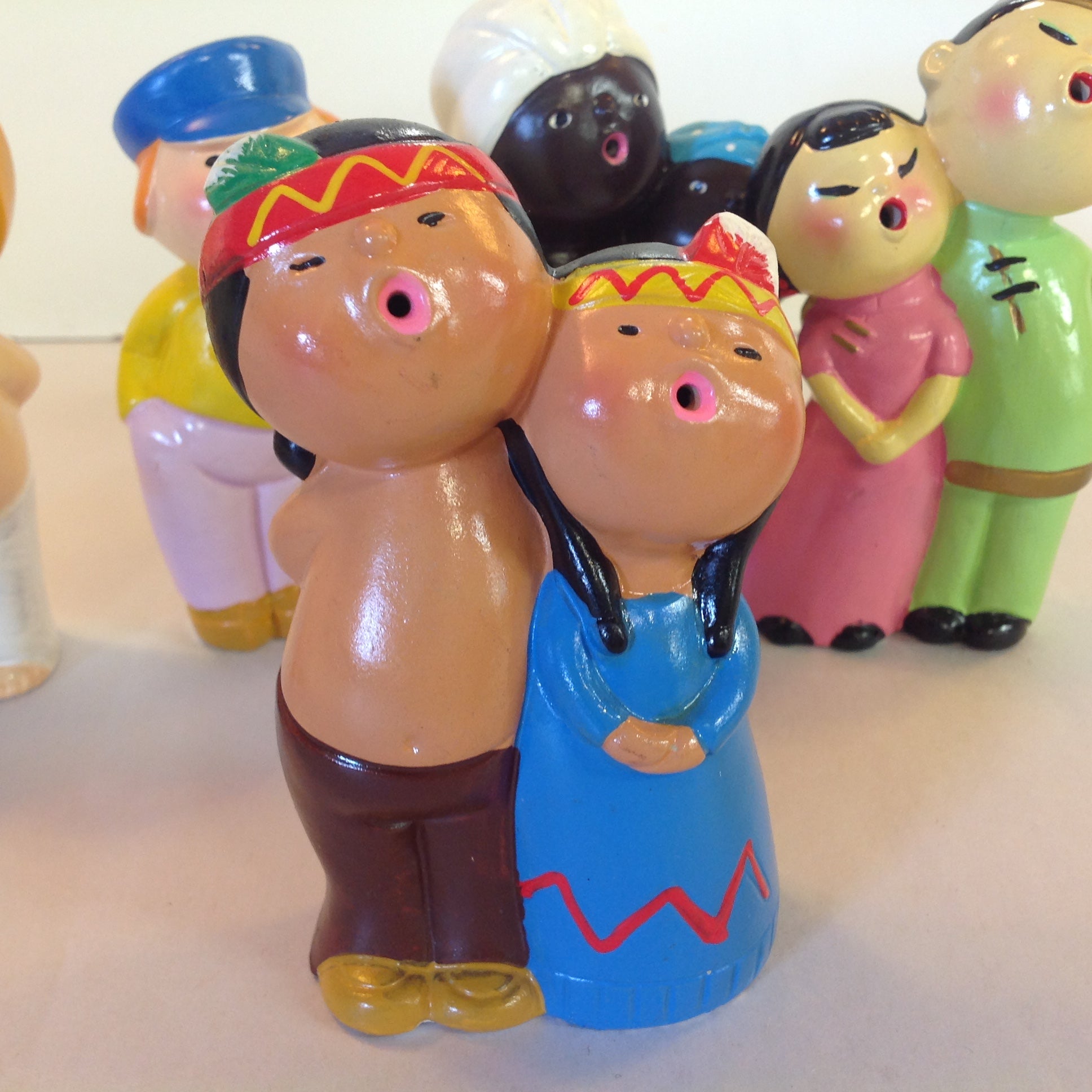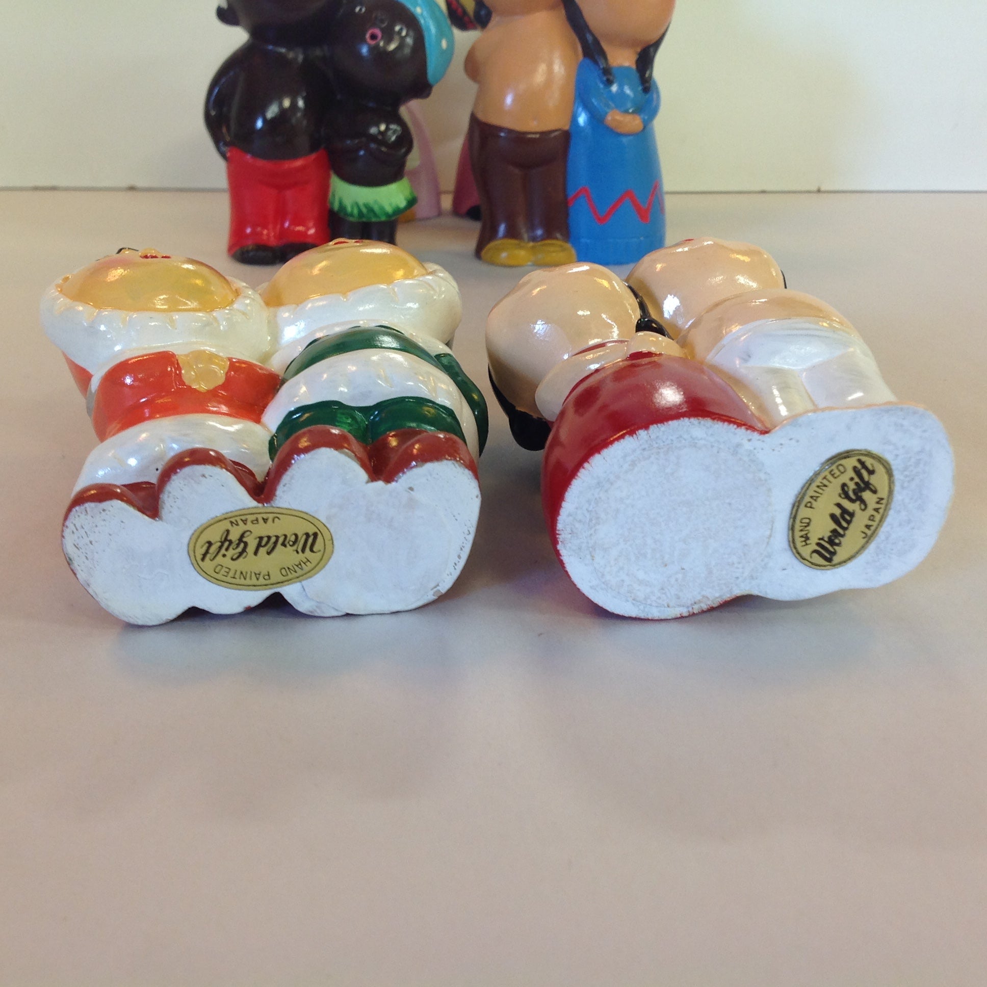 These are vintage used items, in good used condition, with light signs of age/wear; there is mild rubbing to surface of composite material, light wear along/about bases of figures, missing sticker on Native American couple, minuscule points of blemish/distress. Overall quality is good; smooth/glossy, with excellent preservation of color/sheen and figural embellishments still sharp/vivid. There are no excessive nicks, chips, dents, divots, scrapes, scratches, scuffs, cracks, breaks, stains, residue or repairs. Each figure measures approx 4.5" x 3.5".
