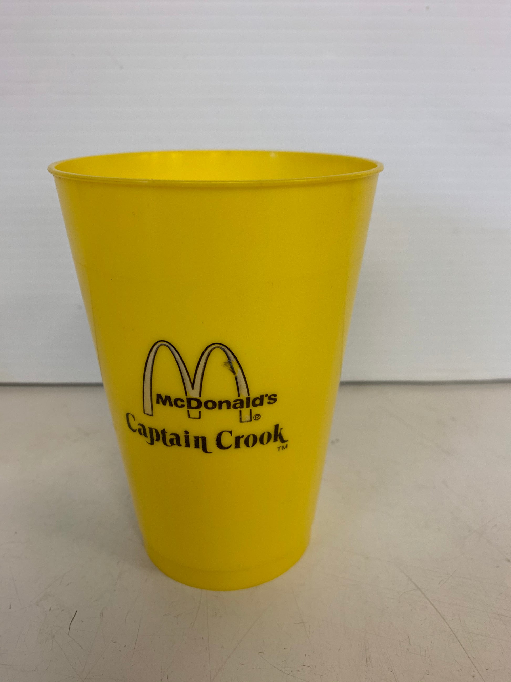 Here is a fantastic vintage piece of McDonald's memorabilia featuring the character of Captain Crook, in full pirate glory on a 4.5" tall yellow plastic drink cup with a 3" wide mouth. This is a vintage used item, in good vintage condition, with minor wear towards top of cup, but overall cup remains clean and graphics are still bright and sharp. The perfect item for the fast-food merchandise collector or diehard McDonald's enthusiast, or the tailgating pirate...