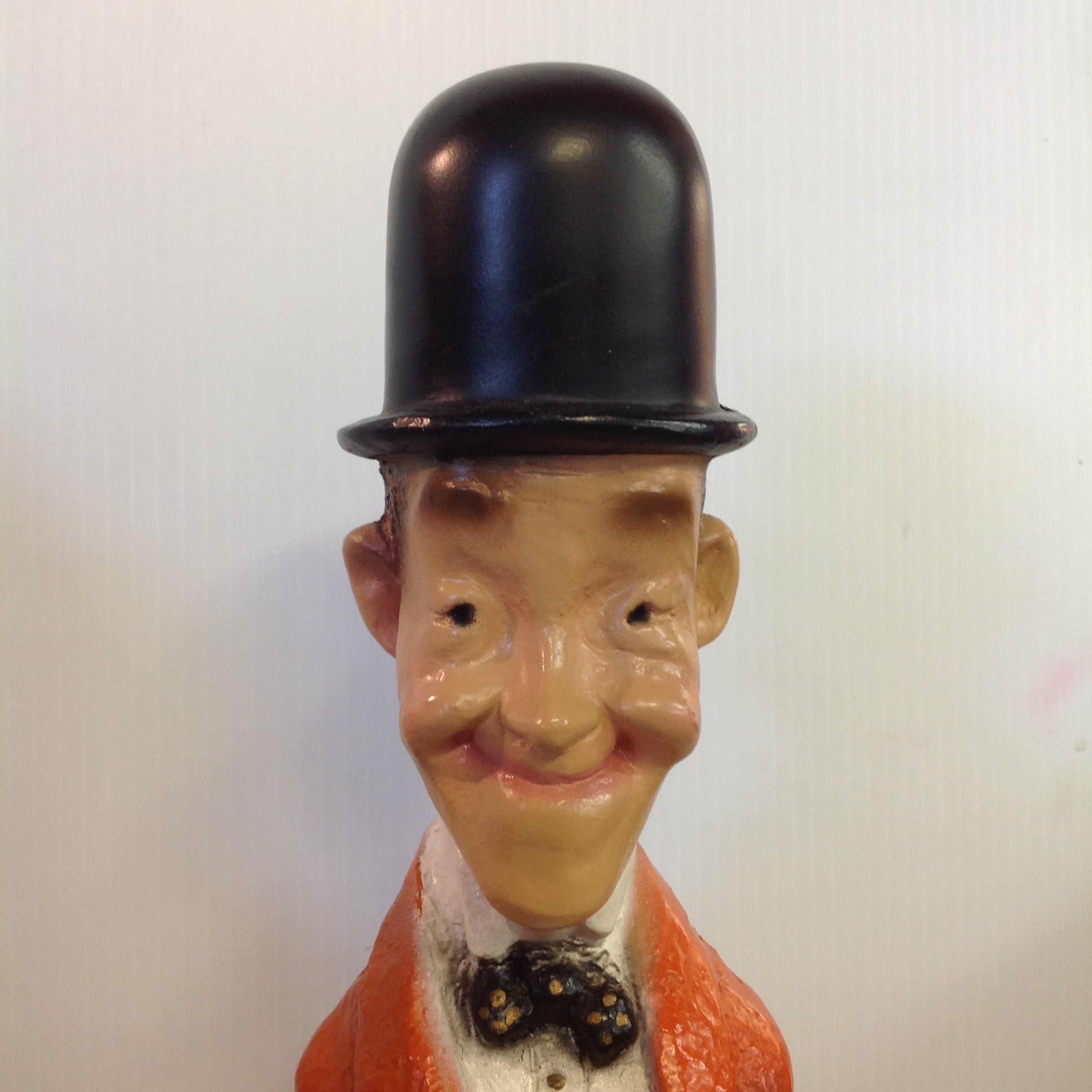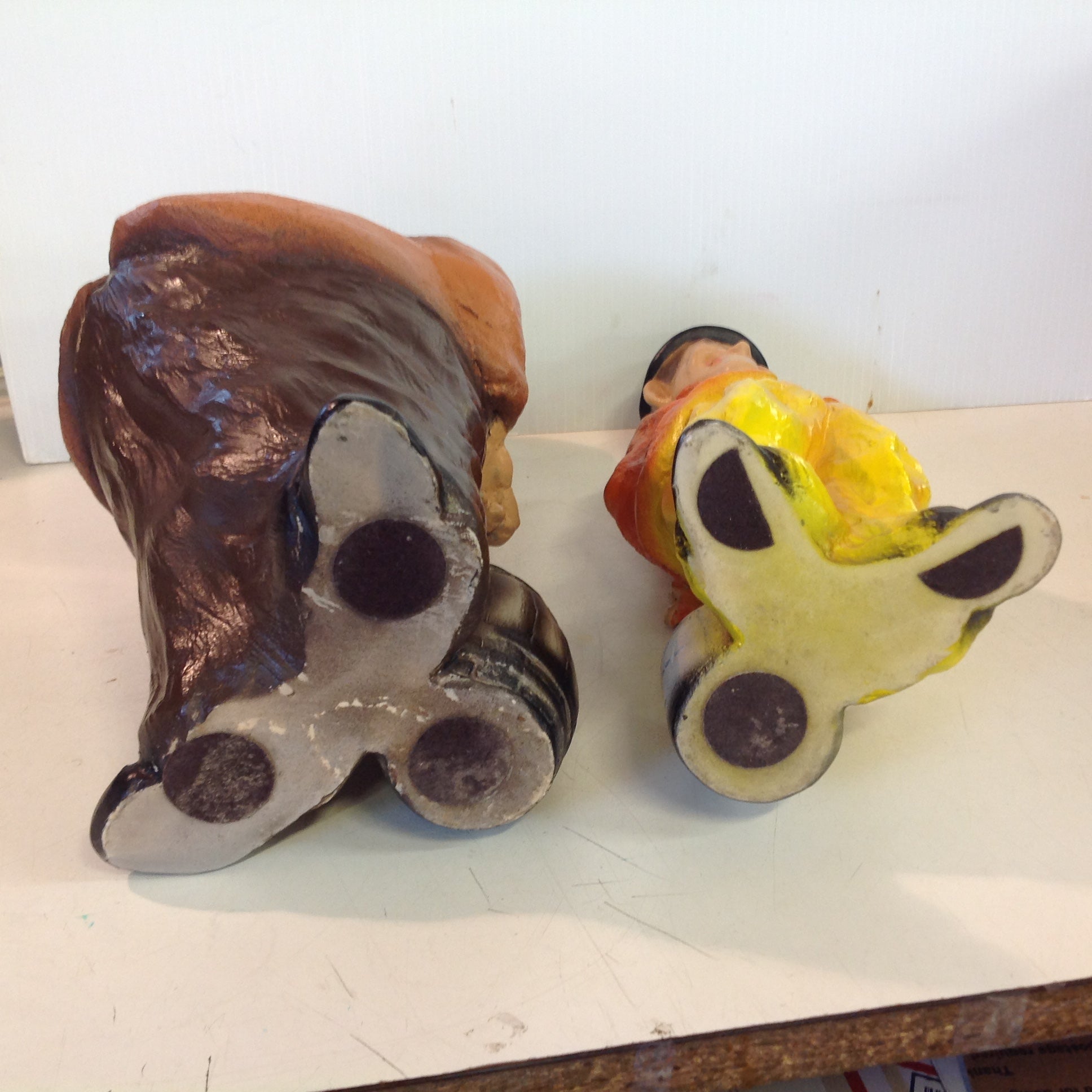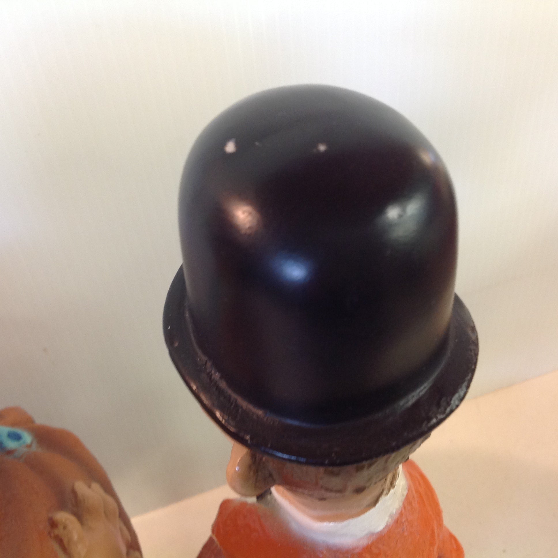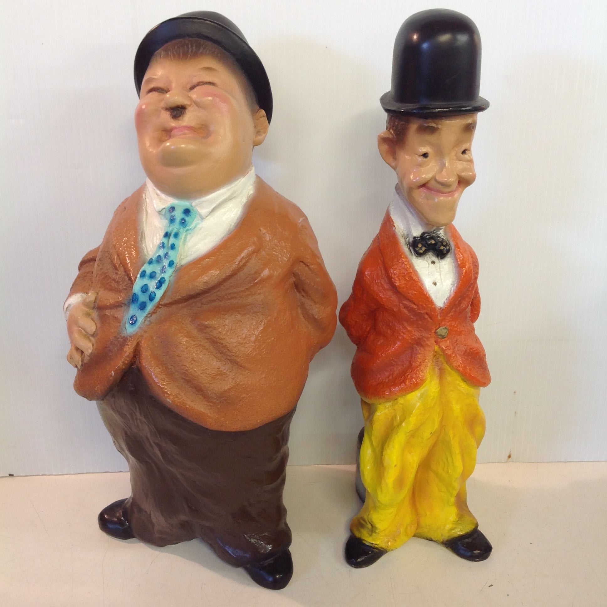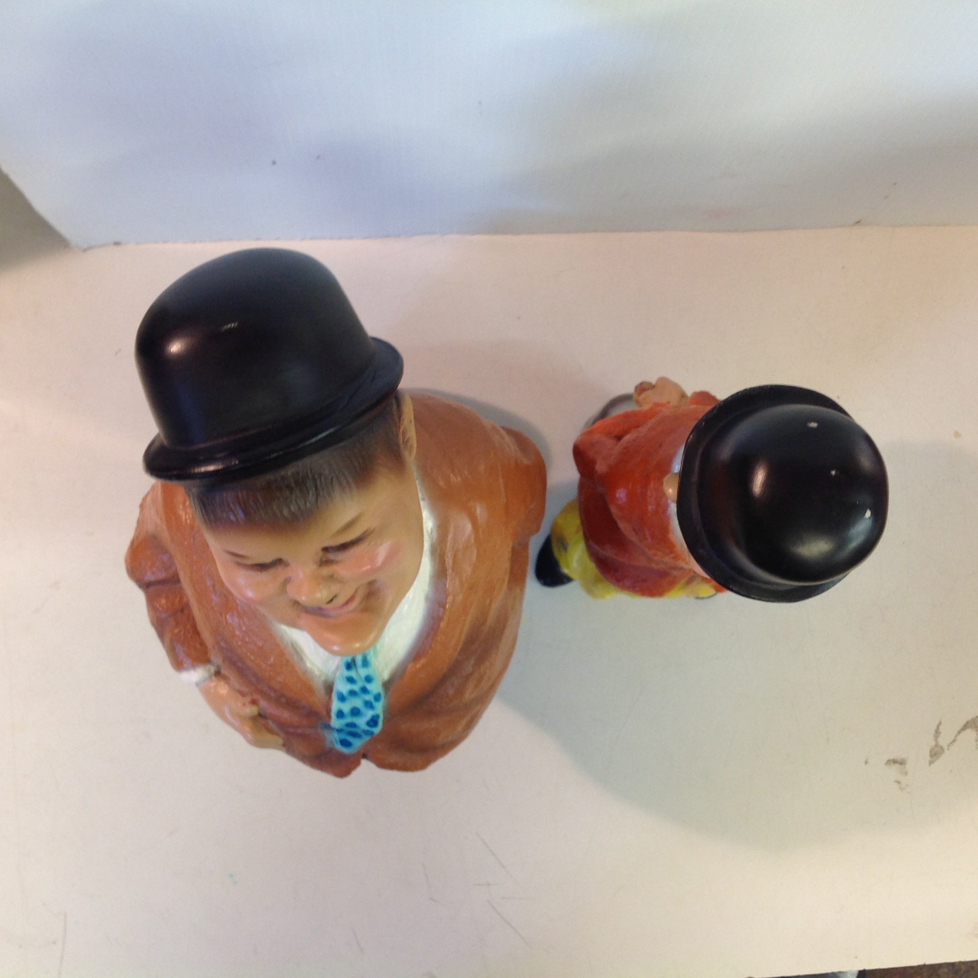 Here is the pair of well-loved comedians Stan Laurel and Oliver Hardy, immortalized in plastic statuary from Universal Studio's 1971 release. These are vintage used items, in good used condition, with light signs of age/wear; there is mild rubbing to surface of plastic, minor points of distress to tops of hats (see pictures), hint of wear to base. Overall plastic quality is good; smooth/glossy, with excellent preservation of color/sheen and figural embellishments remain sharp/clear.