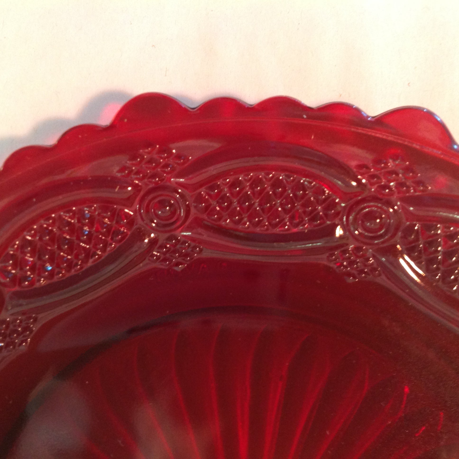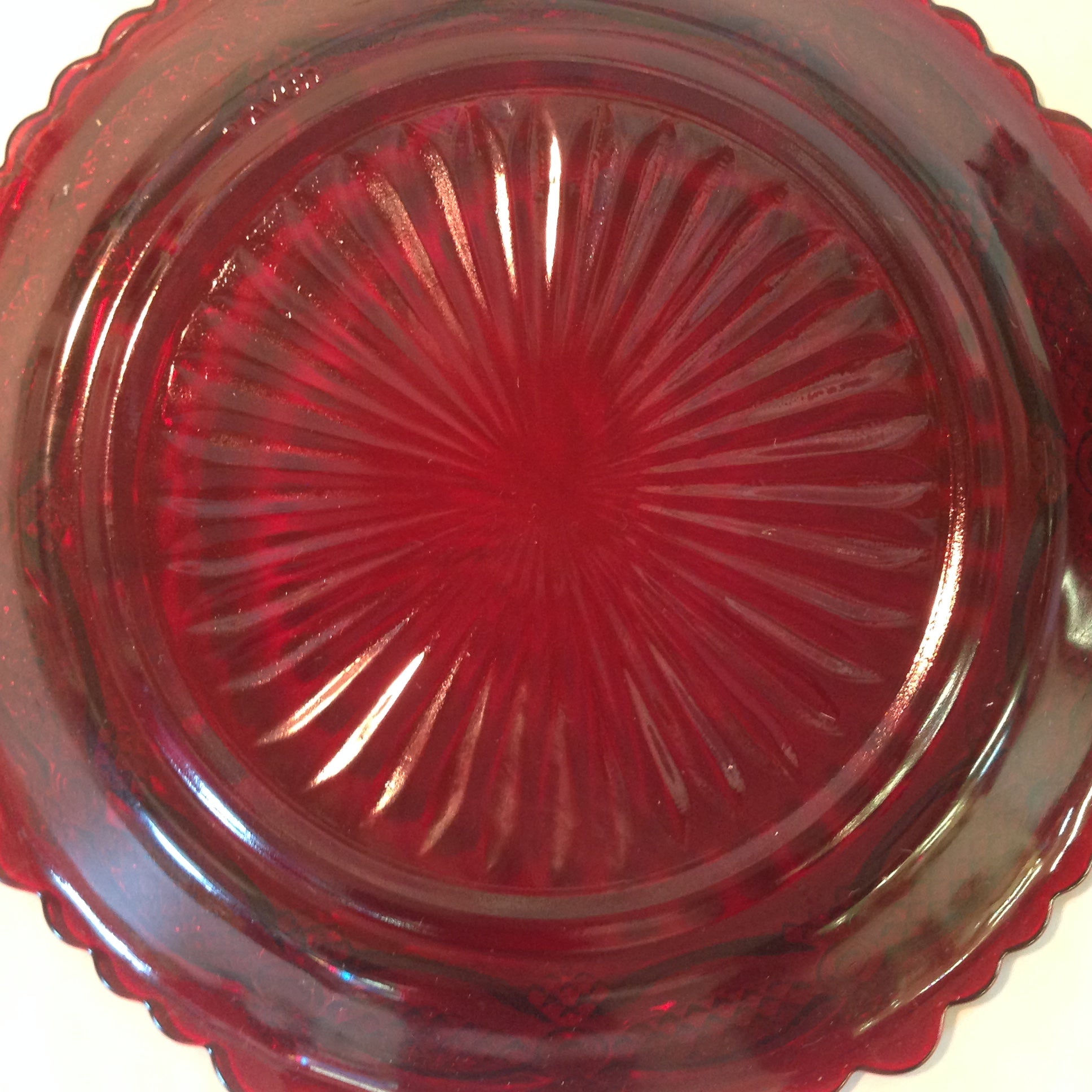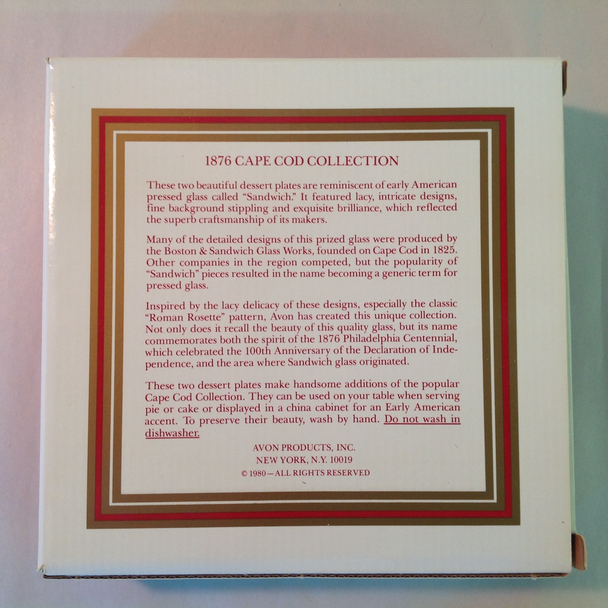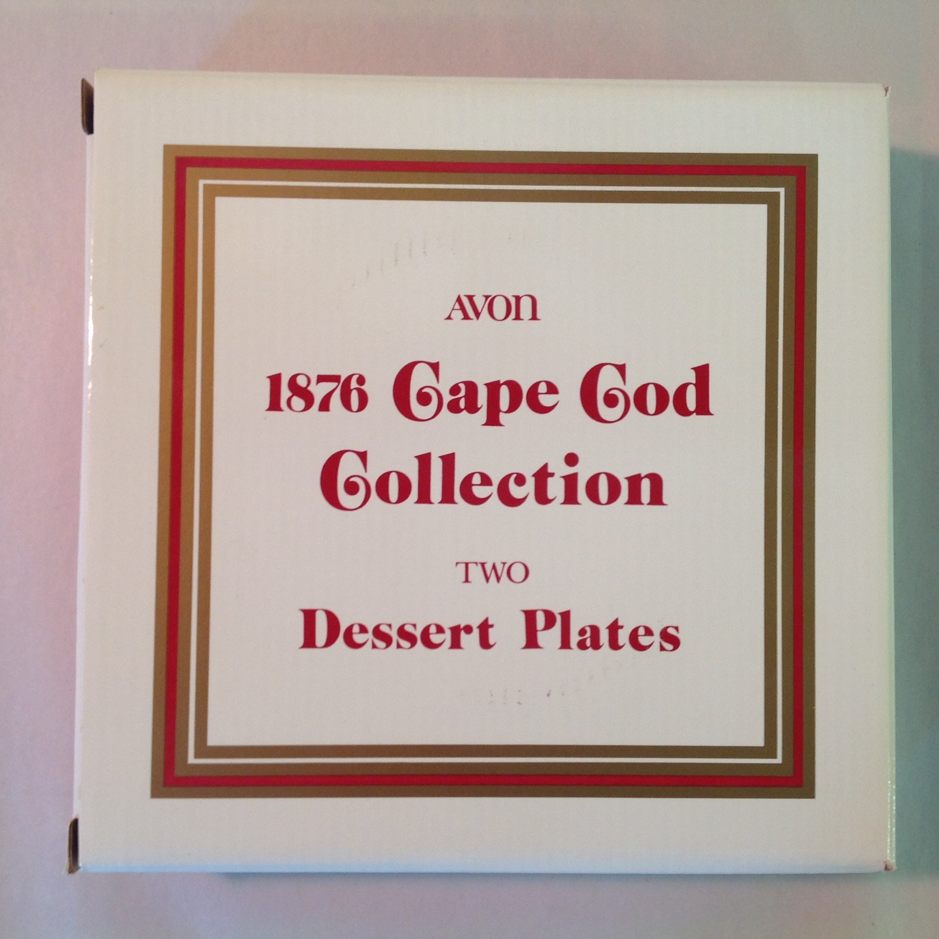 This is a vintage used item, in good used condition, with light signs of age/wear; the plate is still in its original packaging, which has been opened; there is light rubbing to surface of glass. Overall glass quality is good; clean, smooth/glossy, with excellent preservation of color/sheen and figural embellishments still sharp/bright; appears unused. There are no excessive nicks, chips, dents, divots, scrapes, scratches, scuffs, cracks, breaks, stains, residue or repairs. Each dessert plate measures approx 7.75" wide, with a 1" lift and 4.5" wide base and is stamped "AVON."