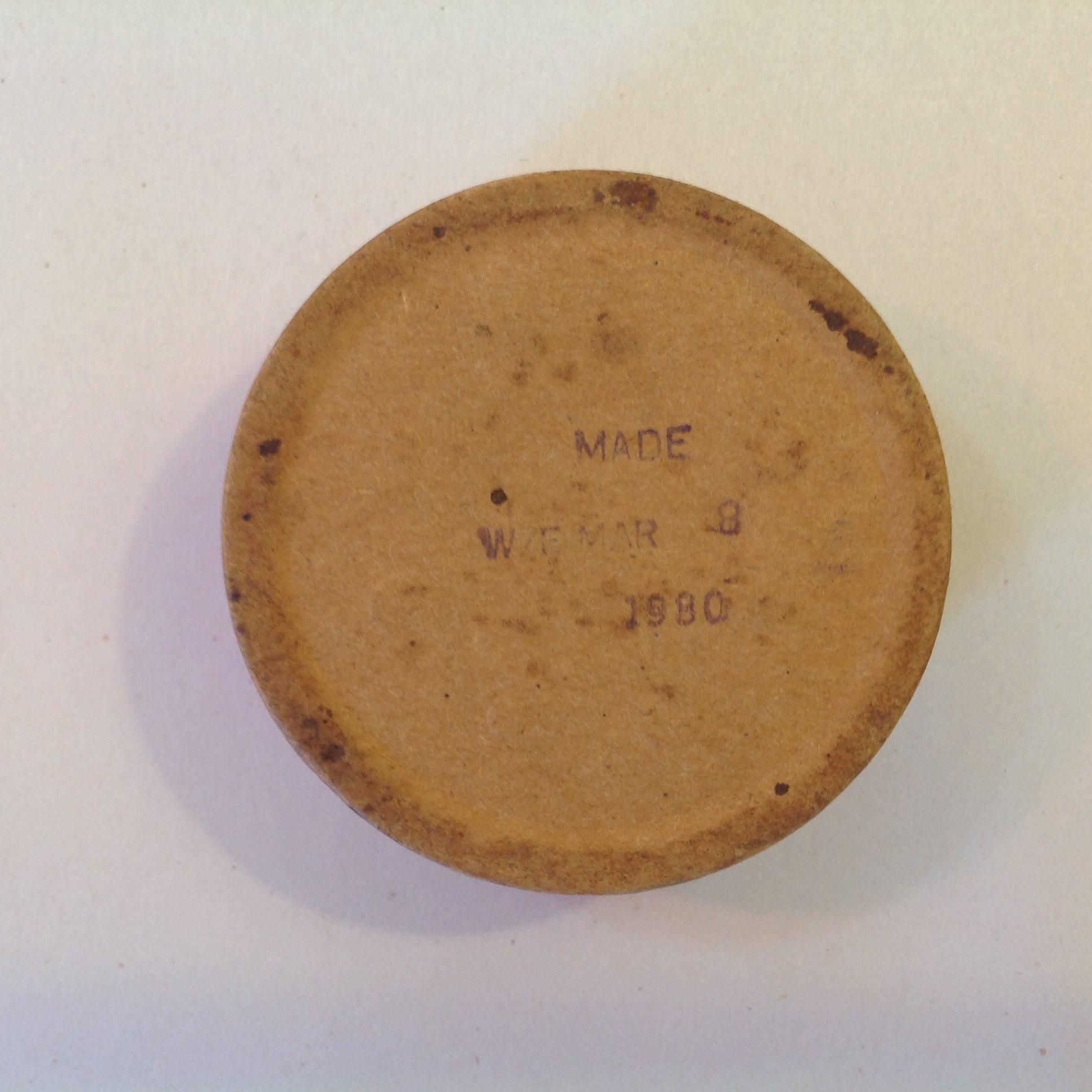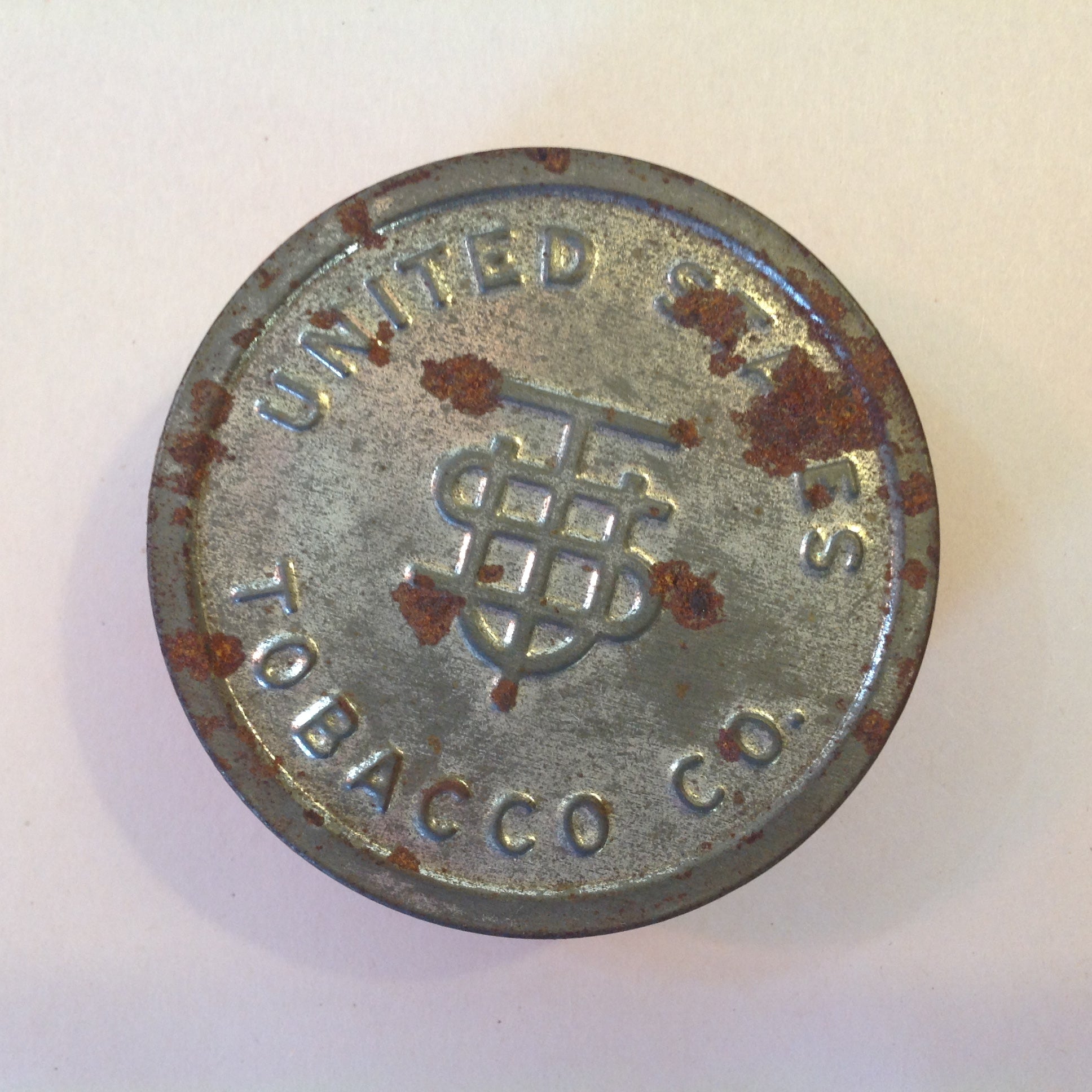 This is a vintage used item, in good used condition, with some signs of age/wear; there is light rubbing/scuffing to surface of tin, wear at base/lid, points of tarnish/rust to lid, fading/smudging to decal, minor points of blemish/distress. Overall quality is good; smooth/clean, with good preservation of color/sheen and graphics still sharp/clear. There are no excessive nicks, chips, dents, divots, scrapes, scratches, scuffs, cracks, breaks, stains, residue or repairs. The tin measures approx 1" tall, with a 2.5" round lid and base.