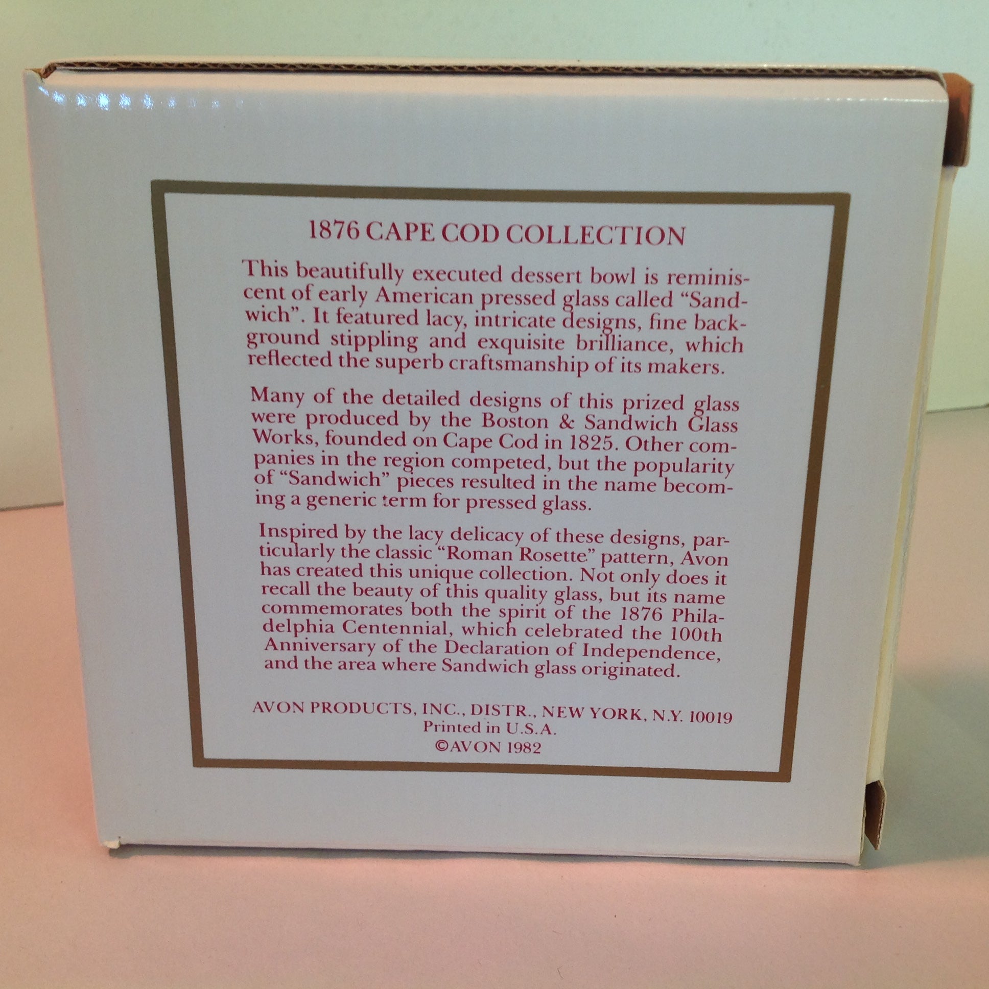 This is a vintage used item, in good used condition, with little sign of age/wear; the bowl is still in its original box, which has been opened; there is light rubbing to surface of glass, nominal wear along/about base. Overall glass quality is good; clean, smooth/glossy, with excellent preservation of color/sheen and figural embellishments still sharp/bright; appears unused. There are no excessive nicks, chips, dents, divots, scrapes, scratches, scuffs, cracks, breaks, stains, residue or repairs. The bowl measures approx 2" tall, with a 5" wide mouth and 3" wide base and is stamped "AVON."