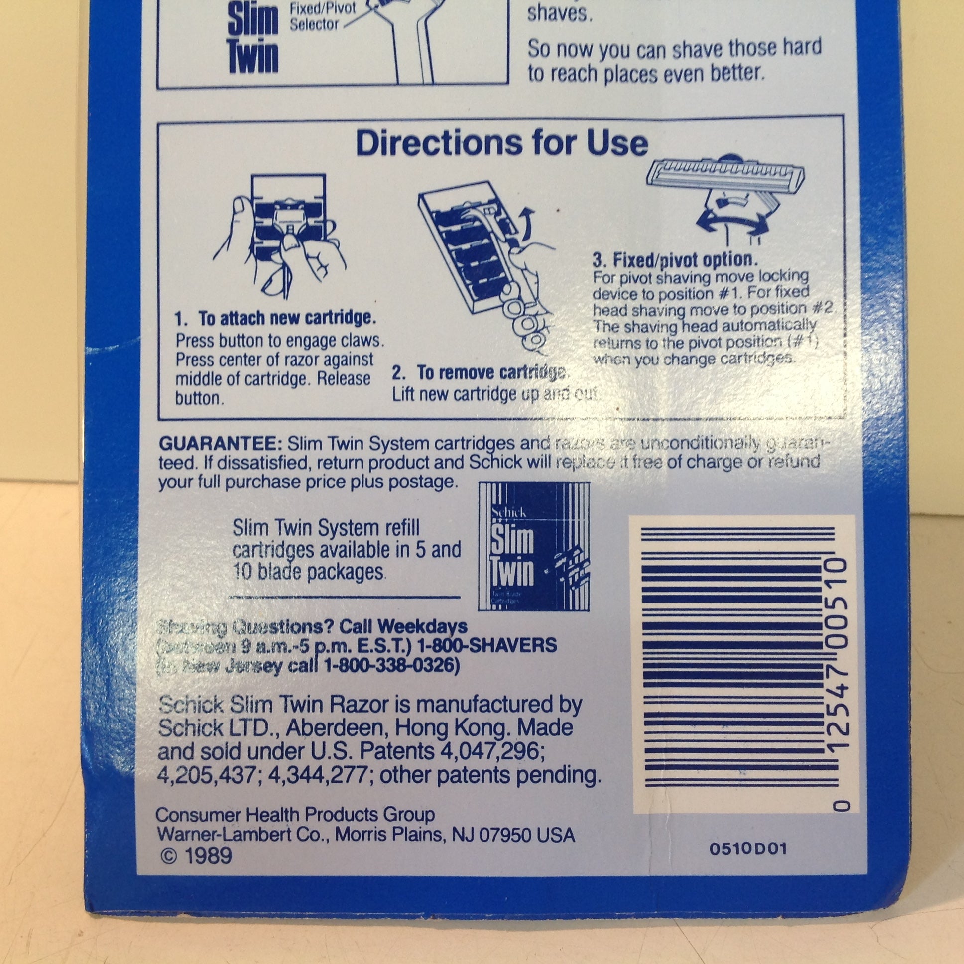 Vintage 1989 NOS Shick Slim Twin Razor System Razor and Two Twin-Blade Cartridges Unopened