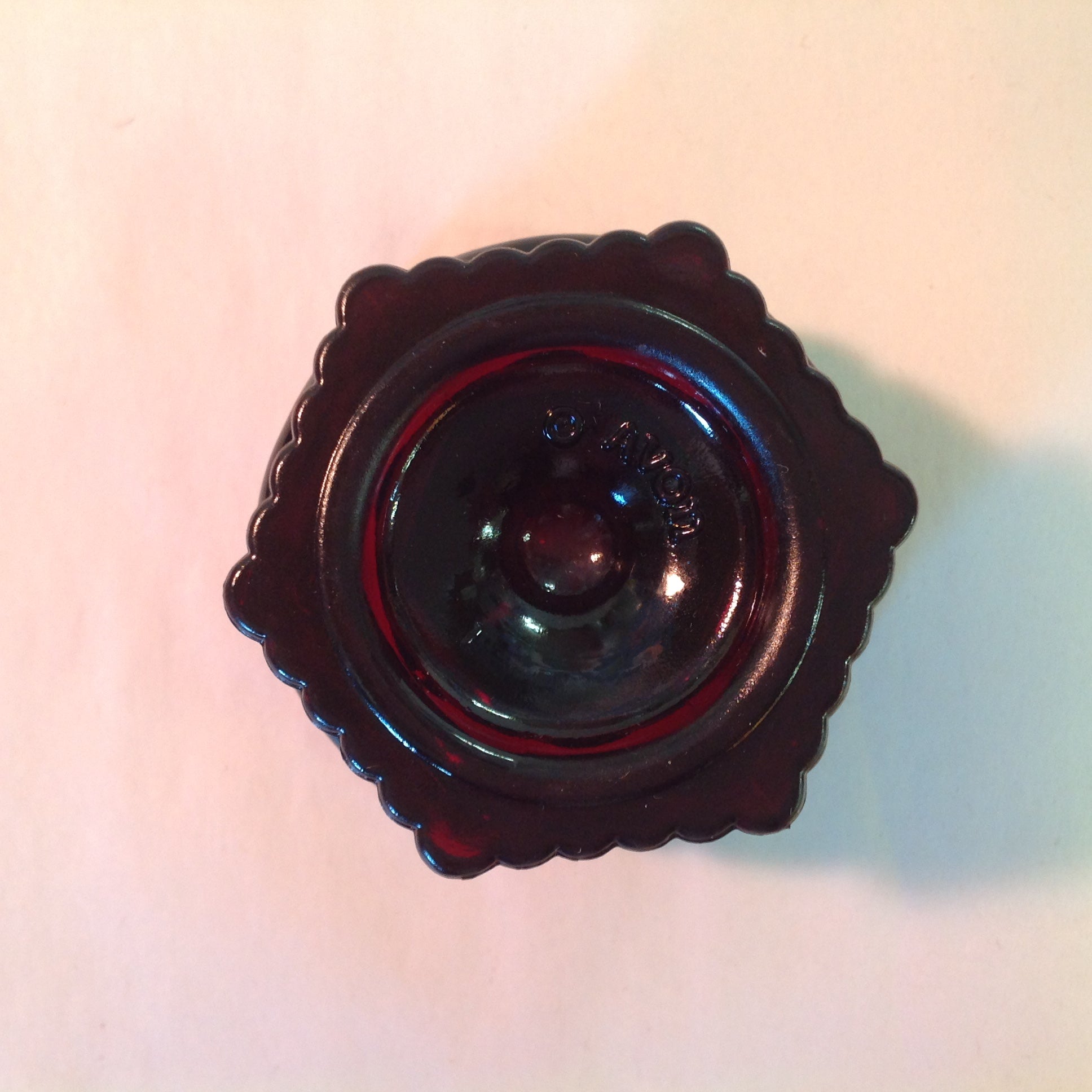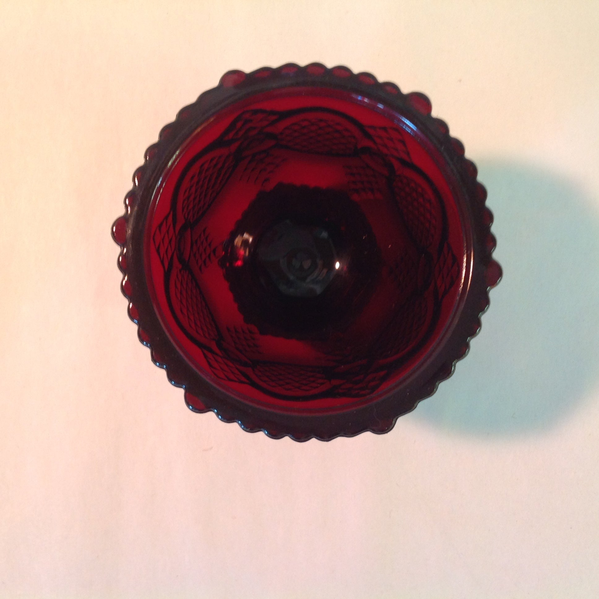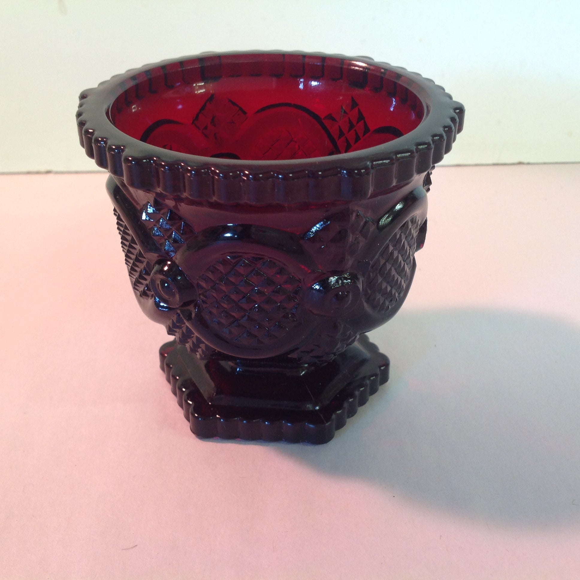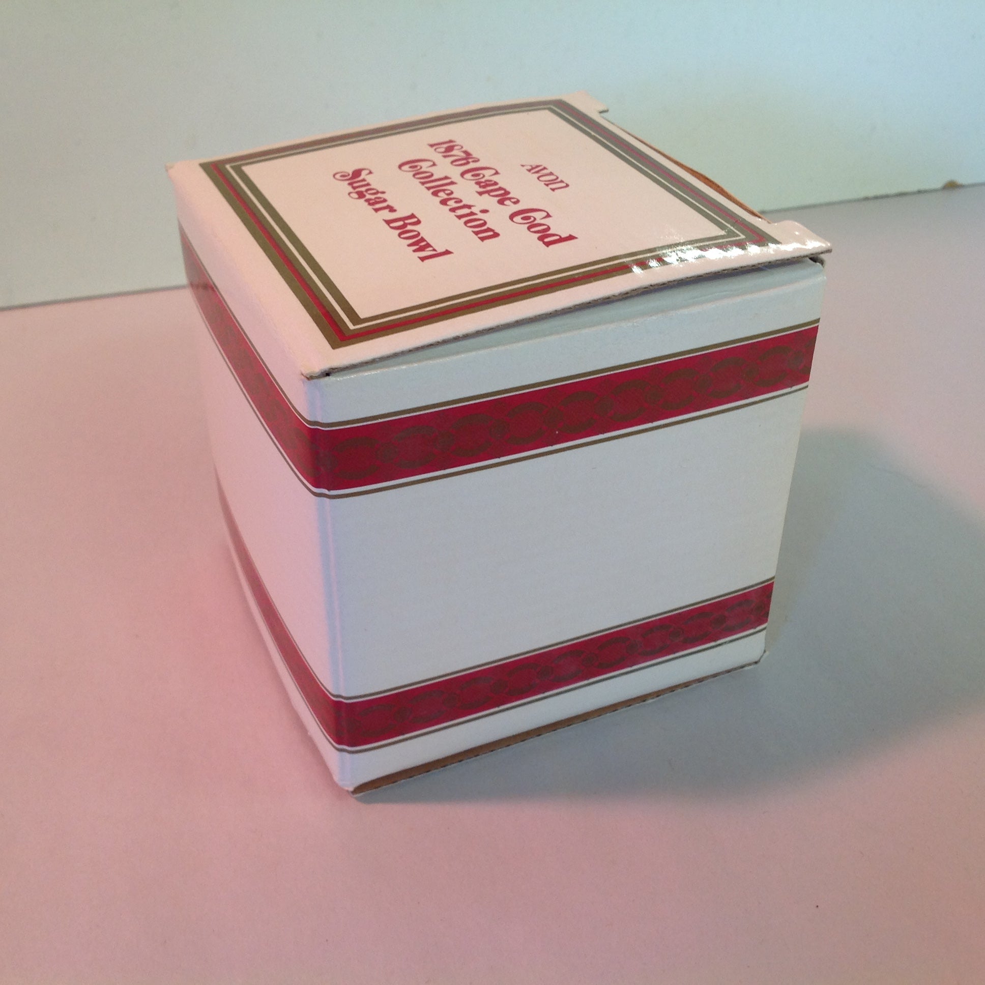 This is a vintage used item, in good used condition, with light signs of age/wear; the sugar bowl is still in its original box, which has been opened; there is mild rubbing to surface of glass, light wear along/about base of bowl. Overall glass quality is good; clean, smooth/glossy, with excellent preservation of color/sheen and figural embellishments still sharp/bright; appears unused. There are no excessive nicks, chips, dents, divots, scrapes, scratches, scuffs, cracks, breaks, stains, residue or repairs. The sugar bowl measures approx 3.5" tall, with a 3" wide mouth and 2.5" wide base, while creamer measures approx 4" tall x 4.5" wide (to handle), with 2.5" wide base.