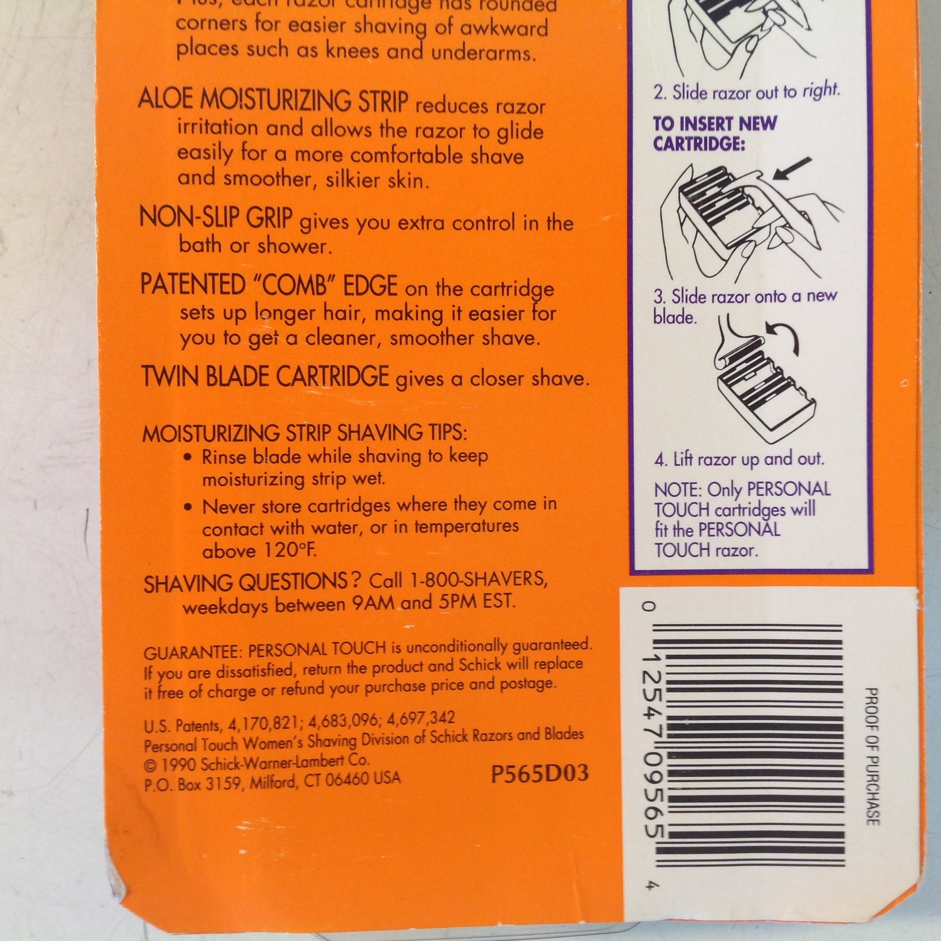 This is a vintage N(ew) O(ld) S(tock) item, in good used condition; it is still in its original packaging, which has not been opened, but shows some signs of age/wear; there is rubbing/scuffing to cardstock packaging, light warp due to storage. Overall quality appears good, smooth/glossy, with blister pack containing razor and blade cartridge unopened and items still intact/without wear.