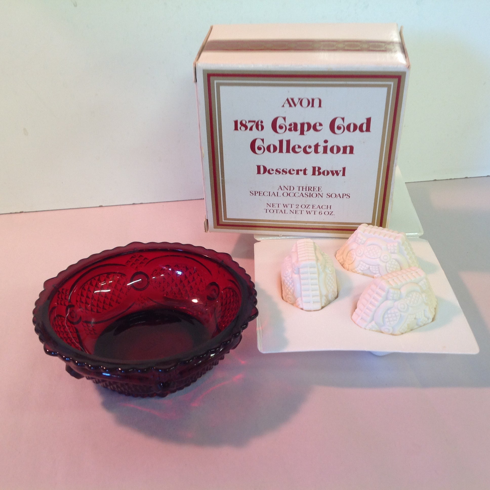 Vintage 1980's Avon 1876 Cape Cod Collection Dessert Bowl and Three Special Occasion Soaps Red Sandwich Glass Unused with Original Box