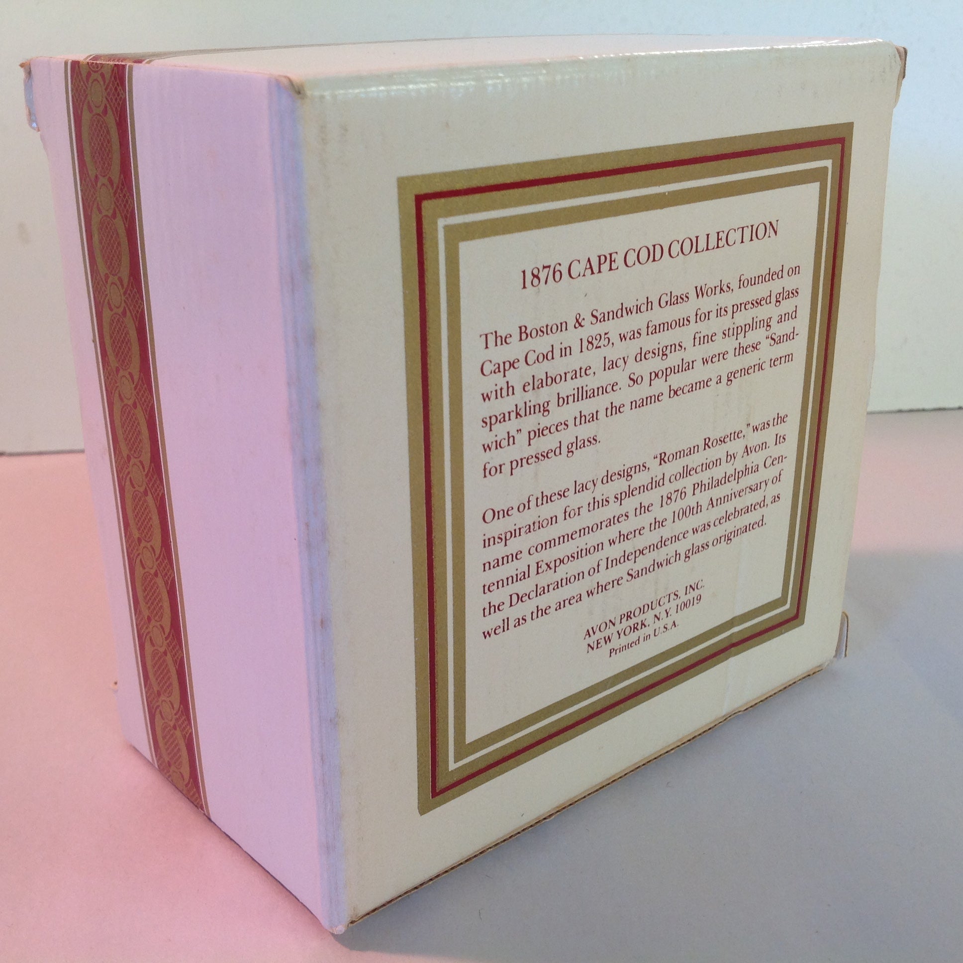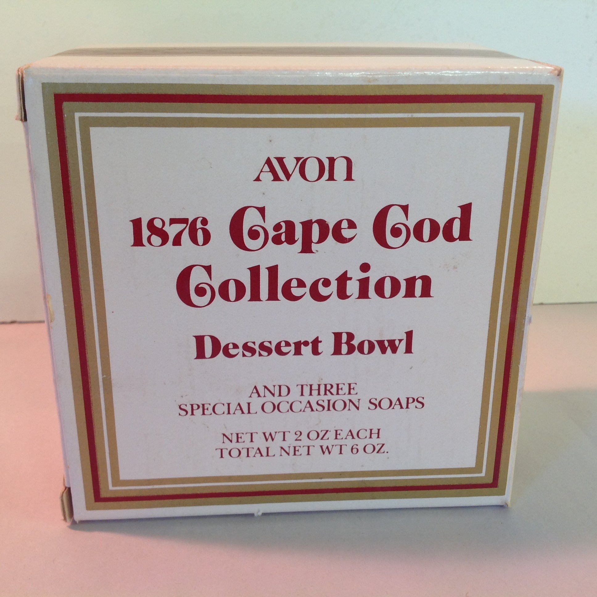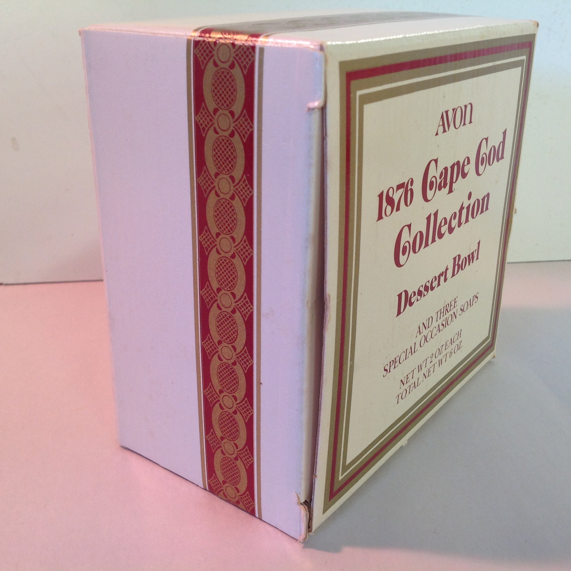 This is a vintage used item, in good used condition, with light signs of age; the dessert bowl and soaps are still in their original packaging, which has been opened; there is light rubbing to surface of glass, light wear along/about base of bowl. Overall glass quality is good; clean, smooth/glossy, with excellent preservation of color/sheen and figural embellishments still sharp/bright; appears unused. There are no excessive nicks, chips, dents, divots, scrapes, scratches, scuffs, cracks, breaks, stains, residue or repairs. The bowl measures approx 2" tall, with a 5" wide mouth and base approx 3" and is stamped "AVON."