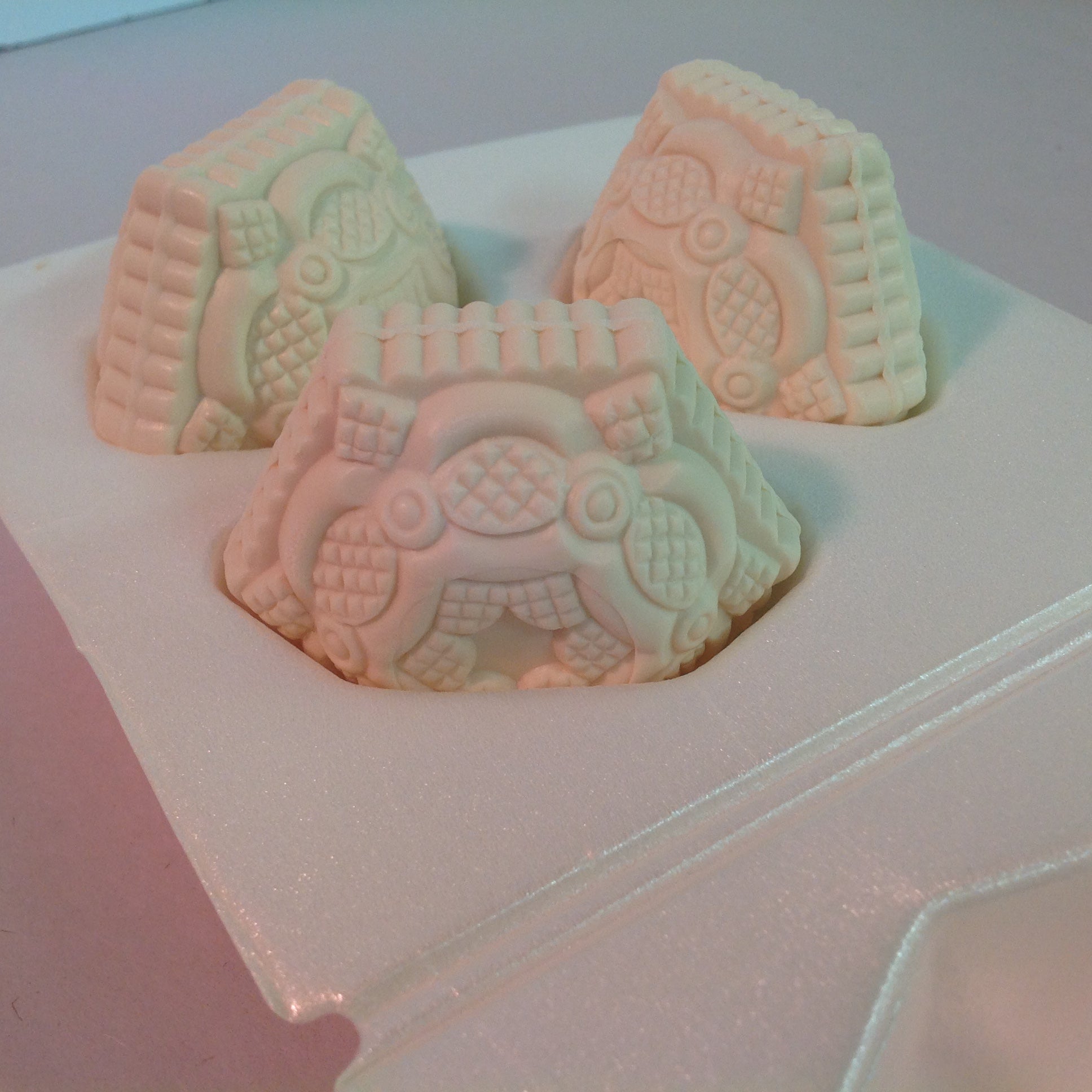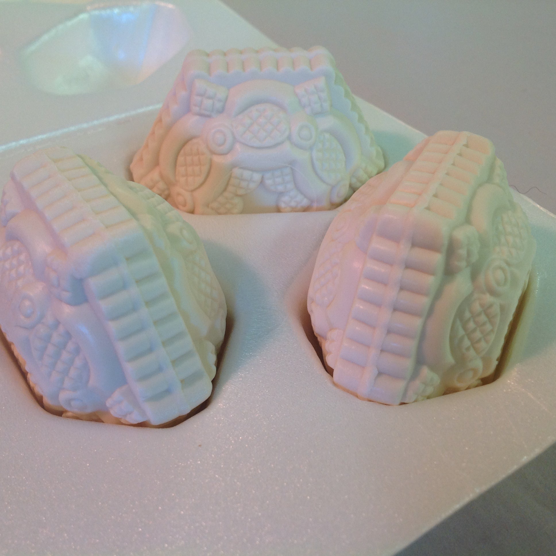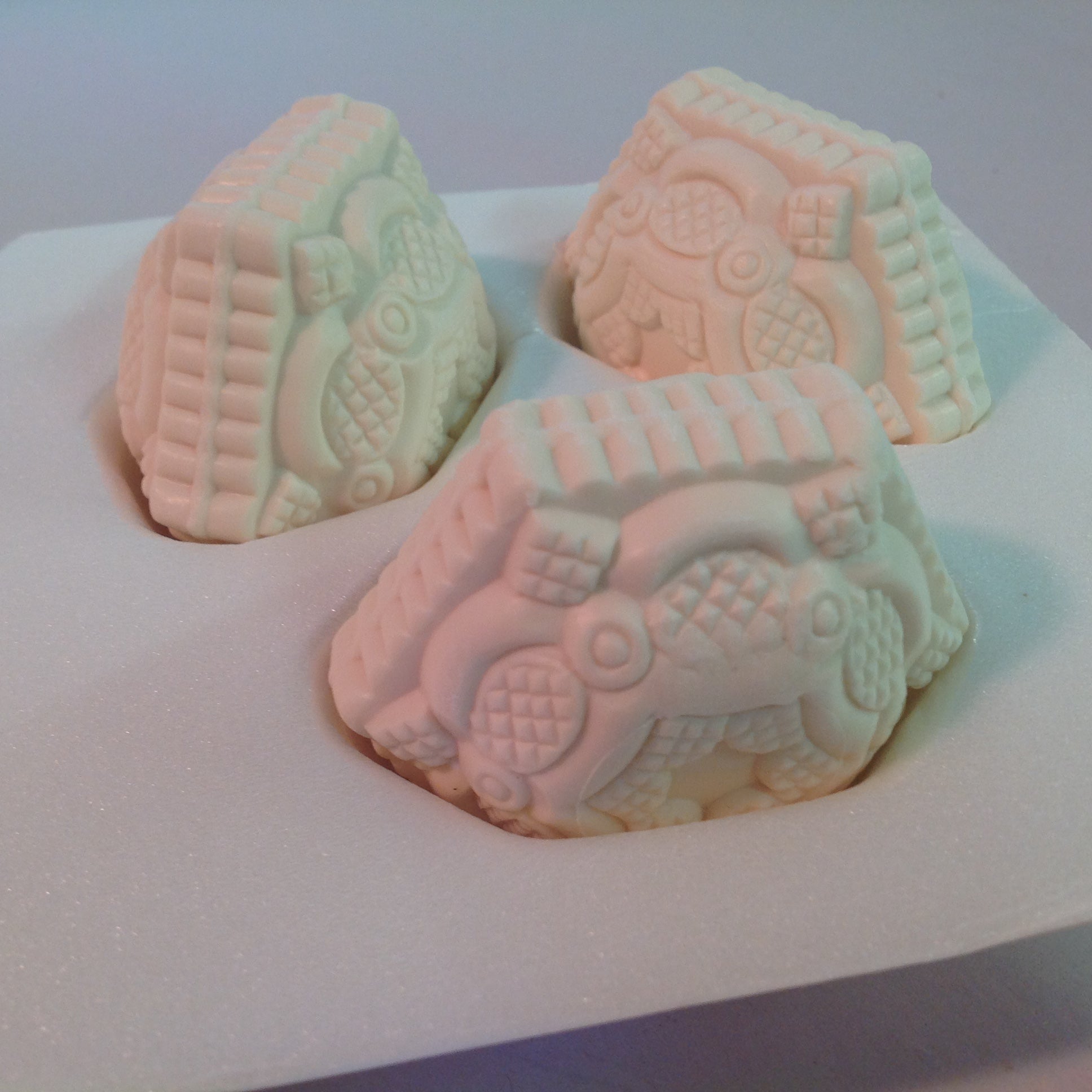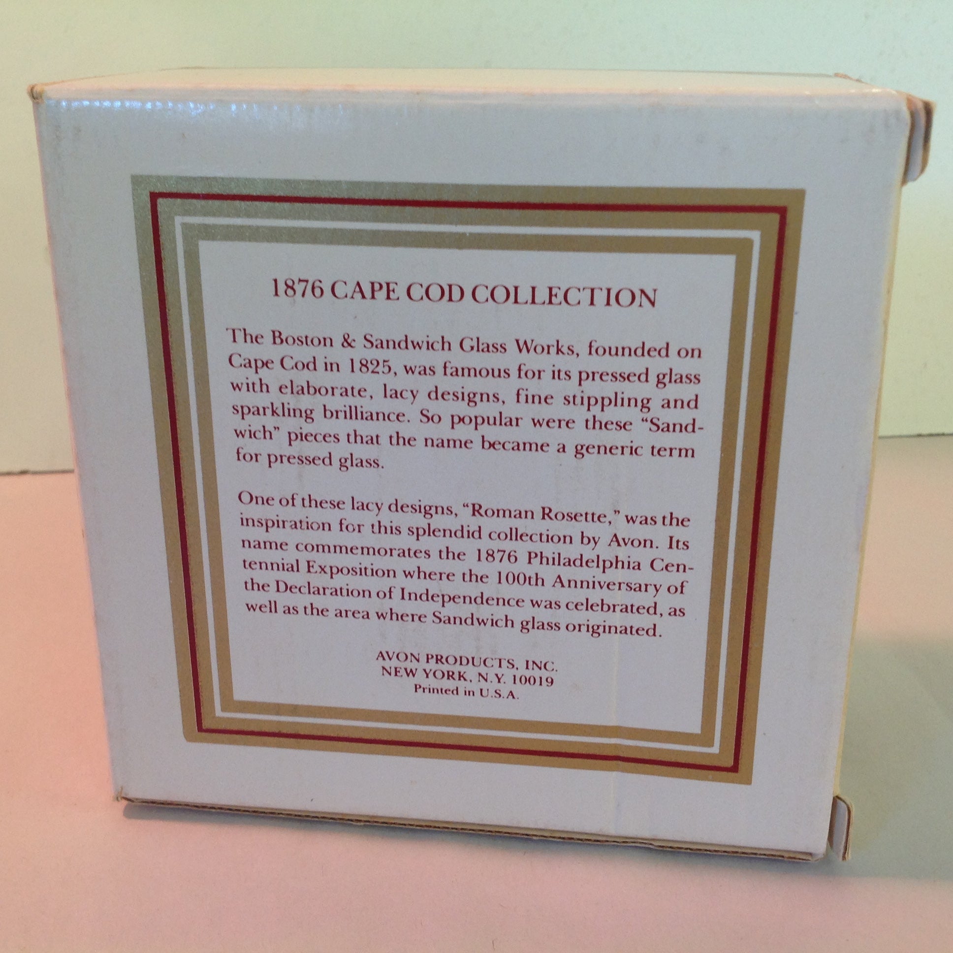 This is a vintage used item, in good used condition, with light signs of age; the dessert bowl and soaps are still in their original packaging, which has been opened; there is light rubbing to surface of glass, light wear along/about base of bowl. Overall glass quality is good; clean, smooth/glossy, with excellent preservation of color/sheen and figural embellishments still sharp/bright; appears unused. There are no excessive nicks, chips, dents, divots, scrapes, scratches, scuffs, cracks, breaks, stains, residue or repairs. The bowl measures approx 2" tall, with a 5" wide mouth and base approx 3" and is stamped "AVON."