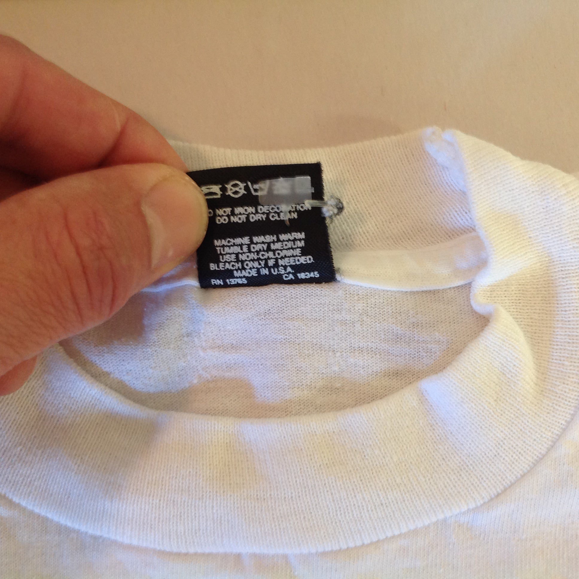 This is a vintage used item, in good used condition, with light signs of age/wear; there is mild rubbing to surface of fabric, light wear along/about collar/cuffs/hem, faint fading, minuscule points of blemish/distress. Overall fabric quality is good; clean/smooth, soft/supple, with good preservation of color/sheen and graphics still sharp/bright. There are no excessive nicks, rips, tears, perforations, stains, residue or repairs. The shirt is labeled as a 6-8 of 50/50 polycotton from Screen Stars Best and is made in the USA. Overall shirt measurements are approx: Shoulder-to-Shoulder: 10.5", Shoulder-to-Sleeve: 4.5", Chest: 24", Overall length: 15".
