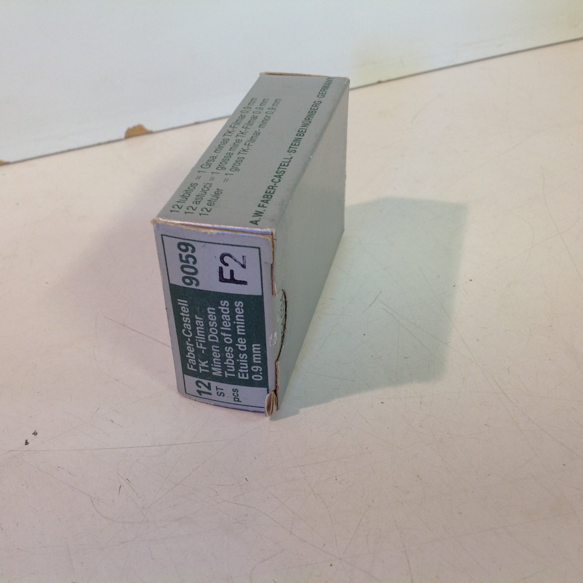 Here is a package of 12 TK-Filmar 90590 0.9 mm (0.036") refill leads for mechanical pencil from A.W. Faber-Castell, in N(ew) O(ld) S(tock) condition, with little sign of wear/age. The leads are still in their original box packaging, which has been opened, but tubes of leads remain in their original state. There are no apparent dents, divots, nicks, cracks, breaks, peeling, residue or repairs. The box measures approx 3" x 1.75" x 1", with 12 tubes of replacement film leads for the 0.9mm mechanical pencil.