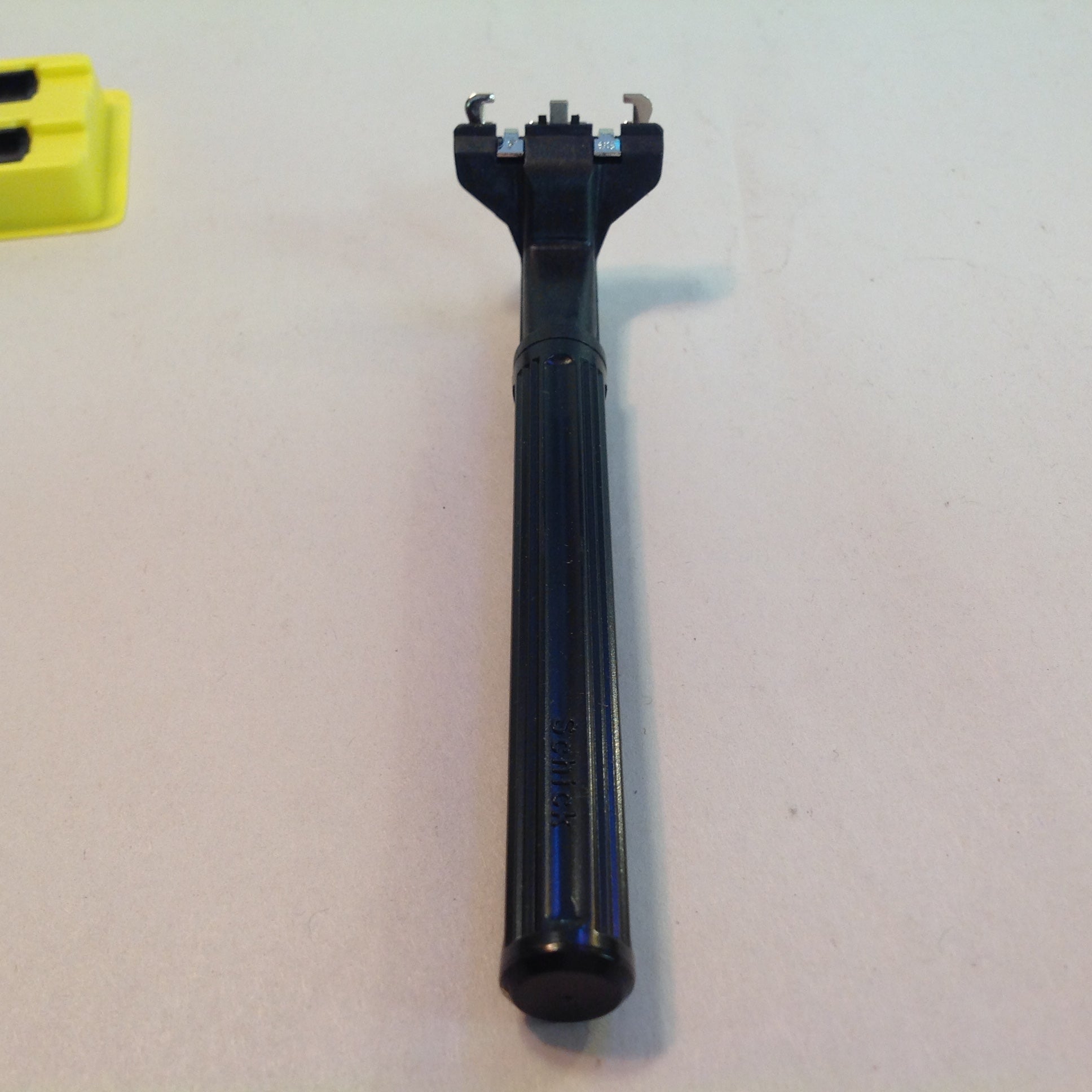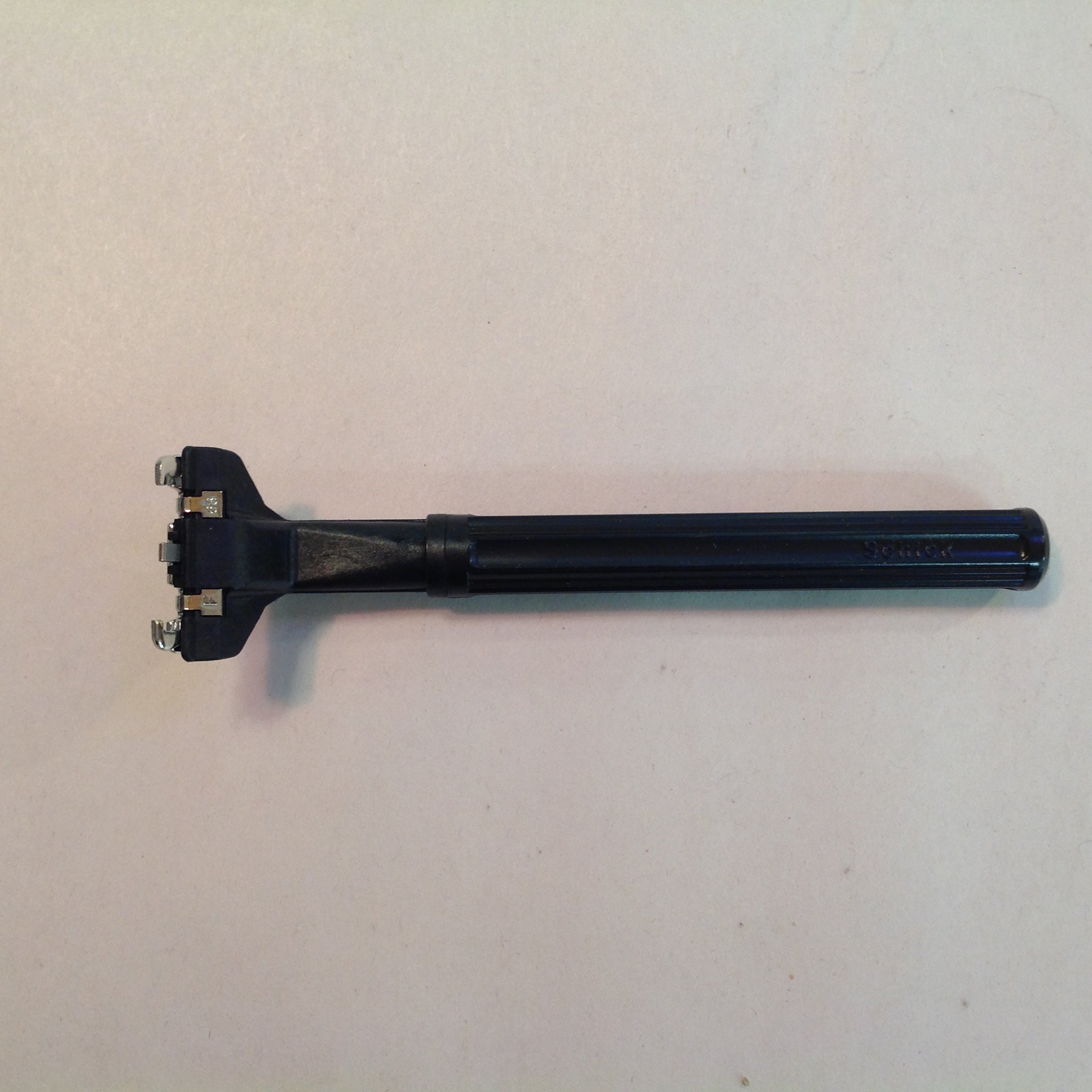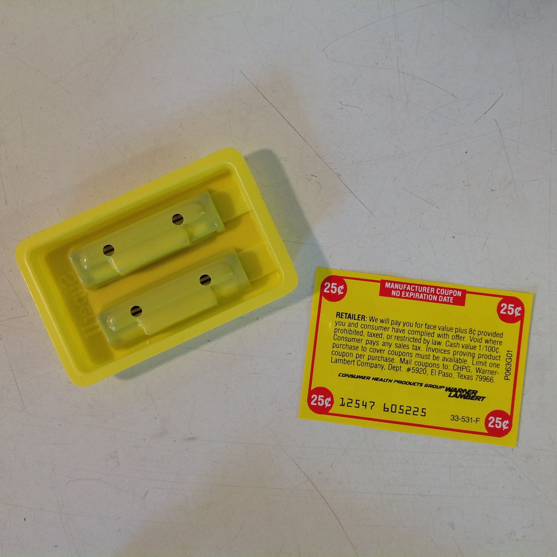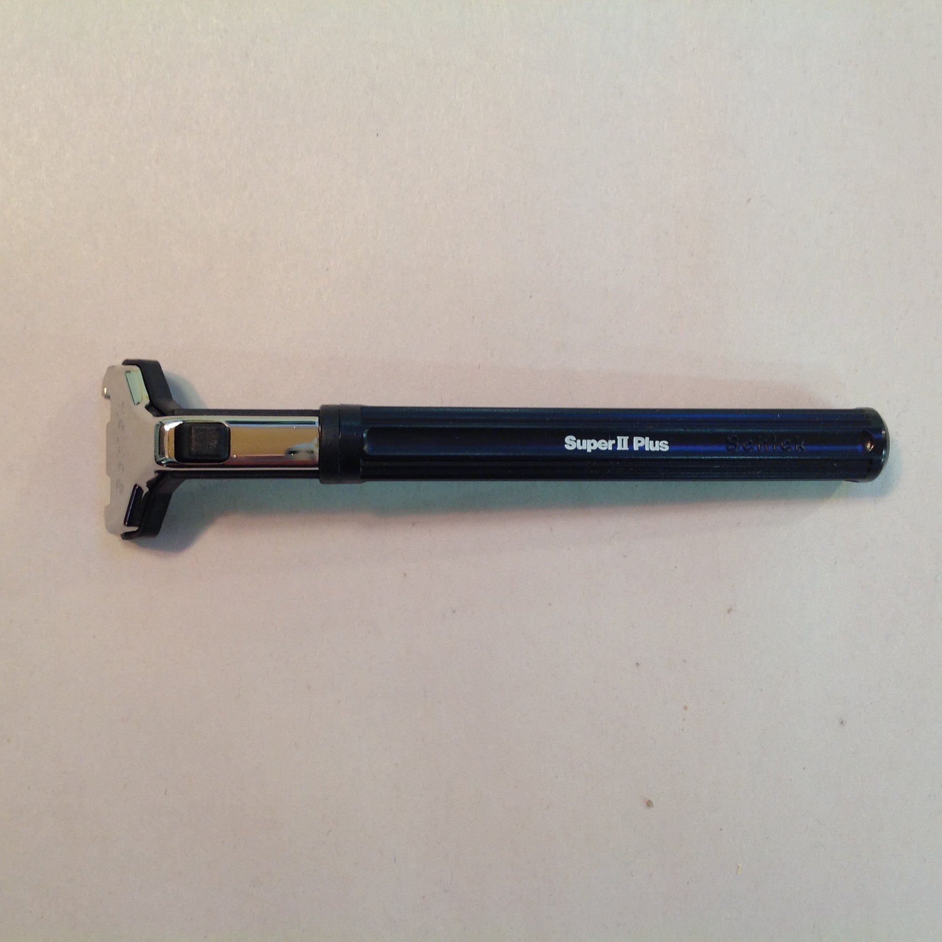 This is a vintage N(ew) O(ld) S(tock) item, in good used condition; it is still in its original packaging, which has been opened, but shows some signs of age/wear; there is rubbing/scuffing to cardstock packaging. Overall quality appears good, smooth/glossy, with razor and blade cartridge remain unused and items still intact/without wear. The razor and twin blade cartridges in packaging measure approx 5" x 2" x 1.25".
