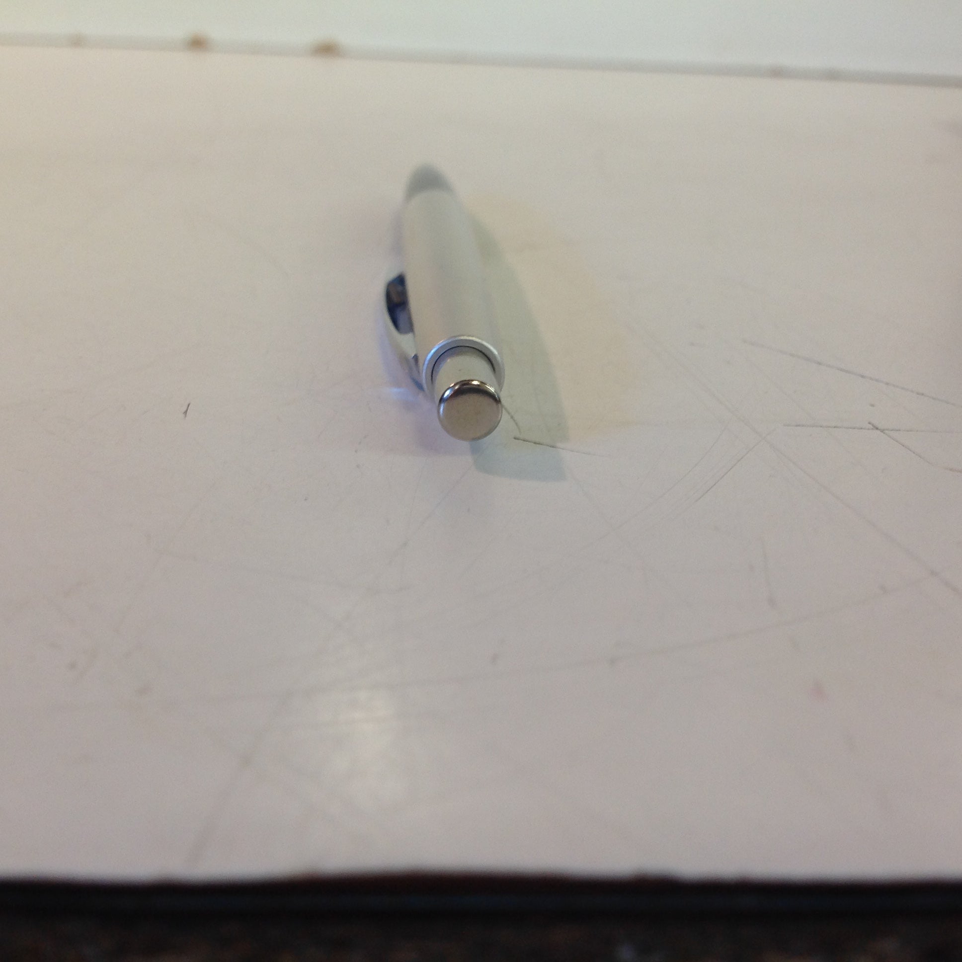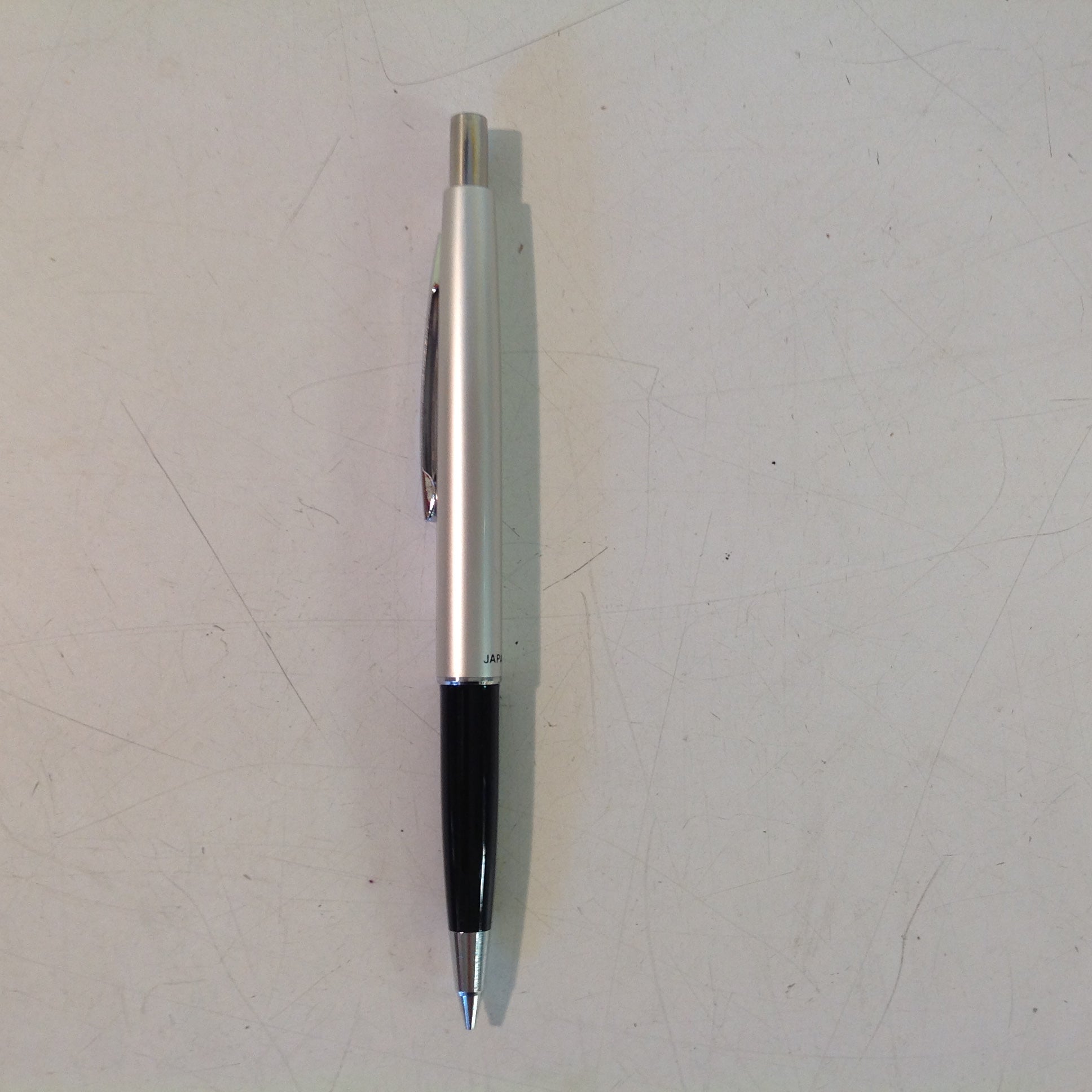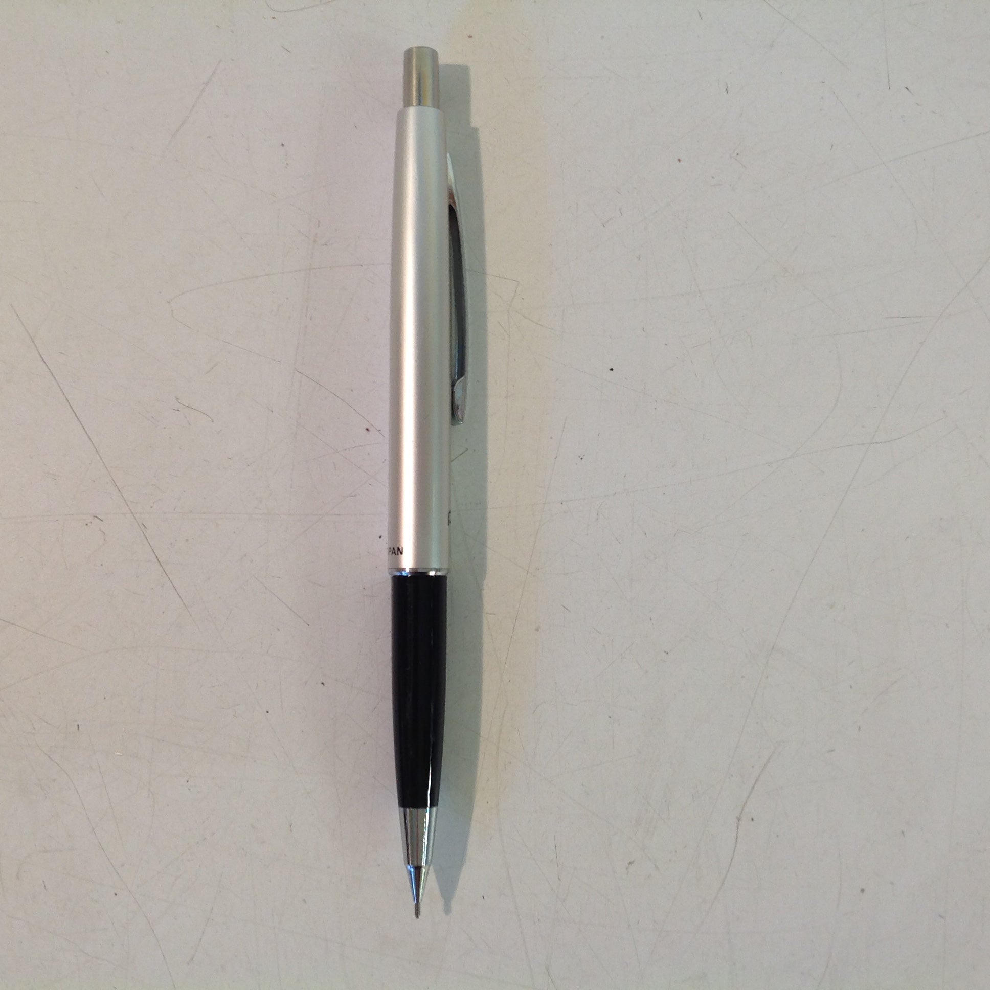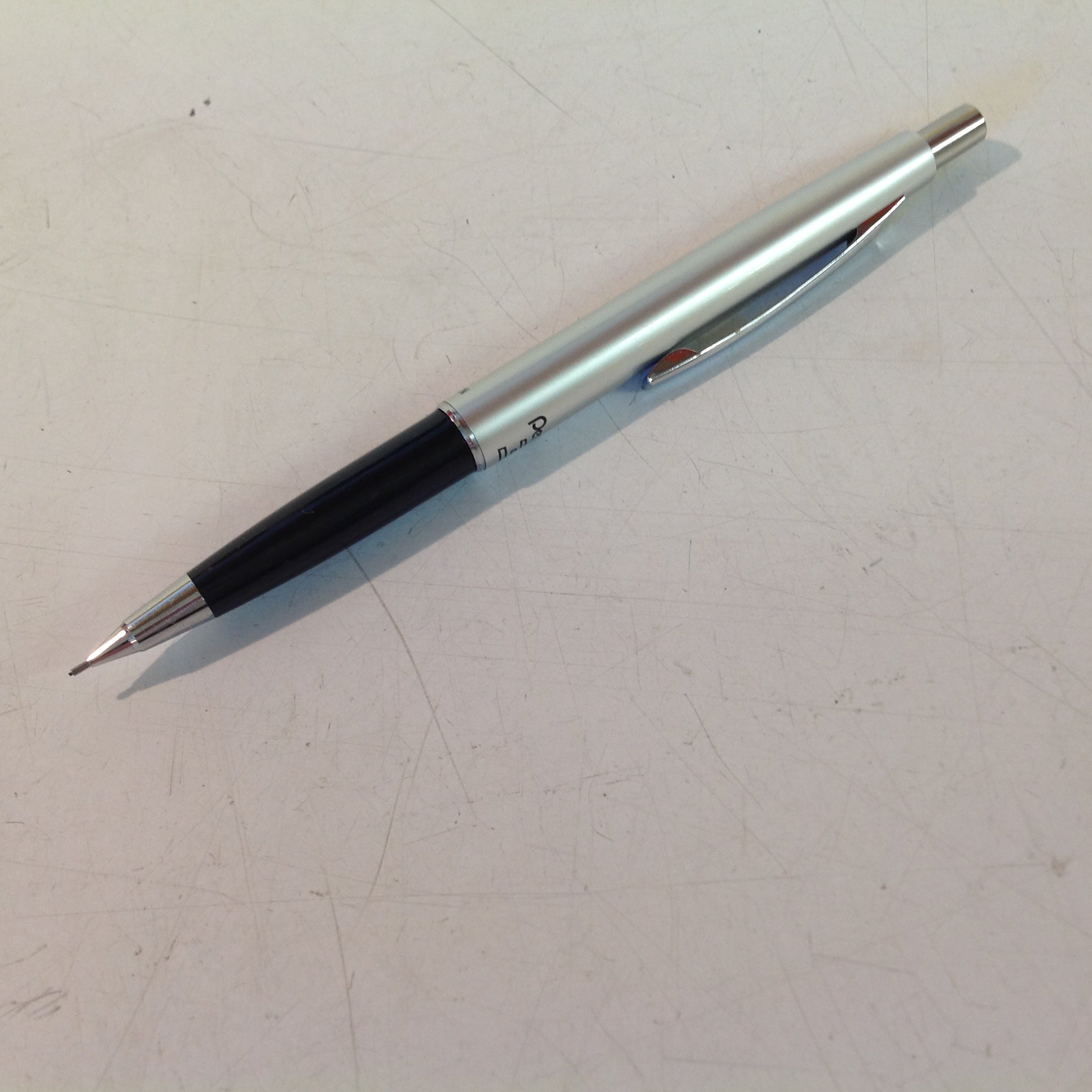 This is a vintage N(ew) O(ld) S(tock) item, in good unused condition; there is light rubbing to surface of pencil. Overall metal/plastic quality is good, smooth/clean, with excellent retention of sheen and graphics still sharp/bright; lead dispenser mechanism is still in good working order. There are no excessive nicks, dents, divots, cracks, breaks, stains, residue or repairs. The pencil measures approx 5" tip-to-tip and .25" wide.