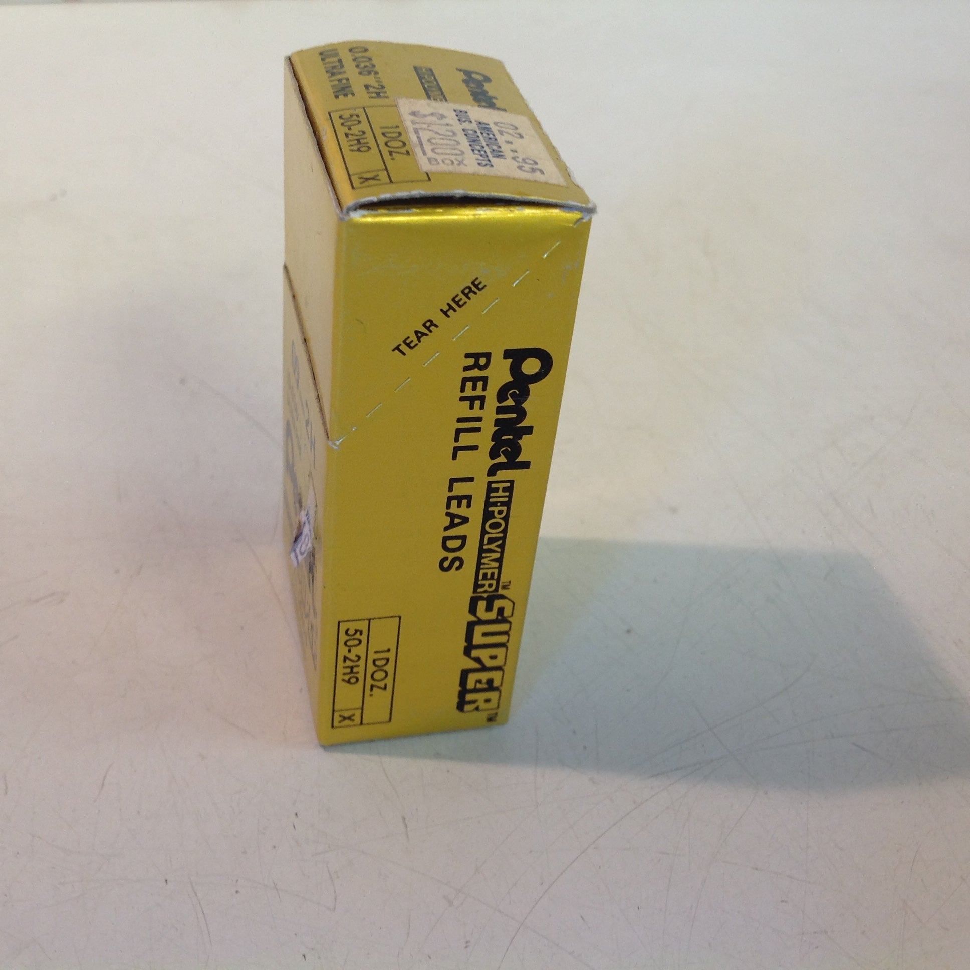 Here is a package of 12 Hi-Polymer Super Thick 0.9 mm (0.036") leads for the mechanical pencil, in N(ew) O(ld) S(tock) condition, with little sign of wear/age. The leads are still in their original box packaging, which has been opened, but tubes of leads are still sticker-sealed. There are no apparent dents, divots, nicks, cracks, breaks, peeling, residue or repairs. The box measures approx 3" x 1.5" x 1", with 12 tubes of 15 replacement "2H" leads for the 0.9mm mechanical pencil.