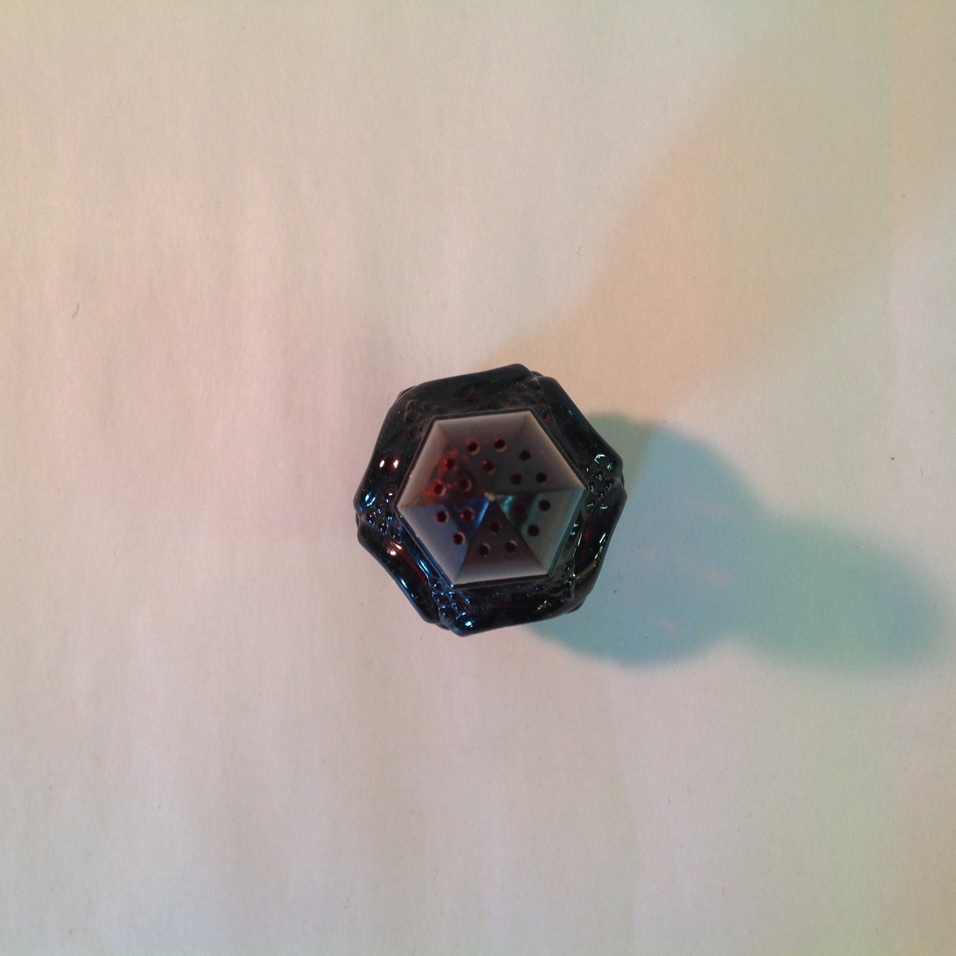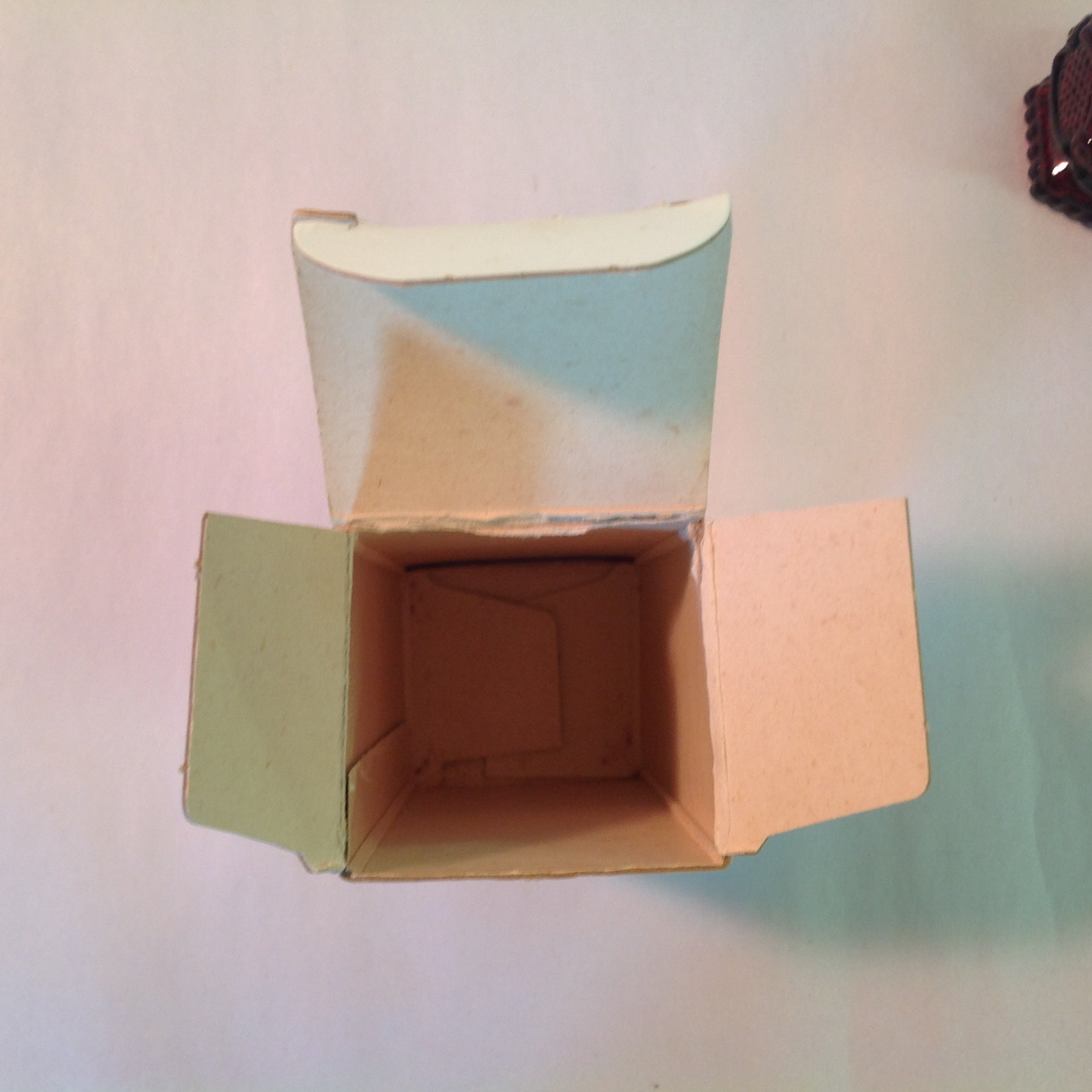 This is a vintage used item, in good used condition, with light signs of age/wear; the shaker is still in its original box, which has been opened; there is mild rubbing to surface of glass, light wear along/about lid and base of shaker; cologne has evaporated. There are no excessive nicks, chips, dents, divots, scrapes, scratches, scuffs, cracks, breaks, stains, residue or repairs. The shaker measures approx 4.5" tall, with a 1.5" wide base and is stamped "AVON."