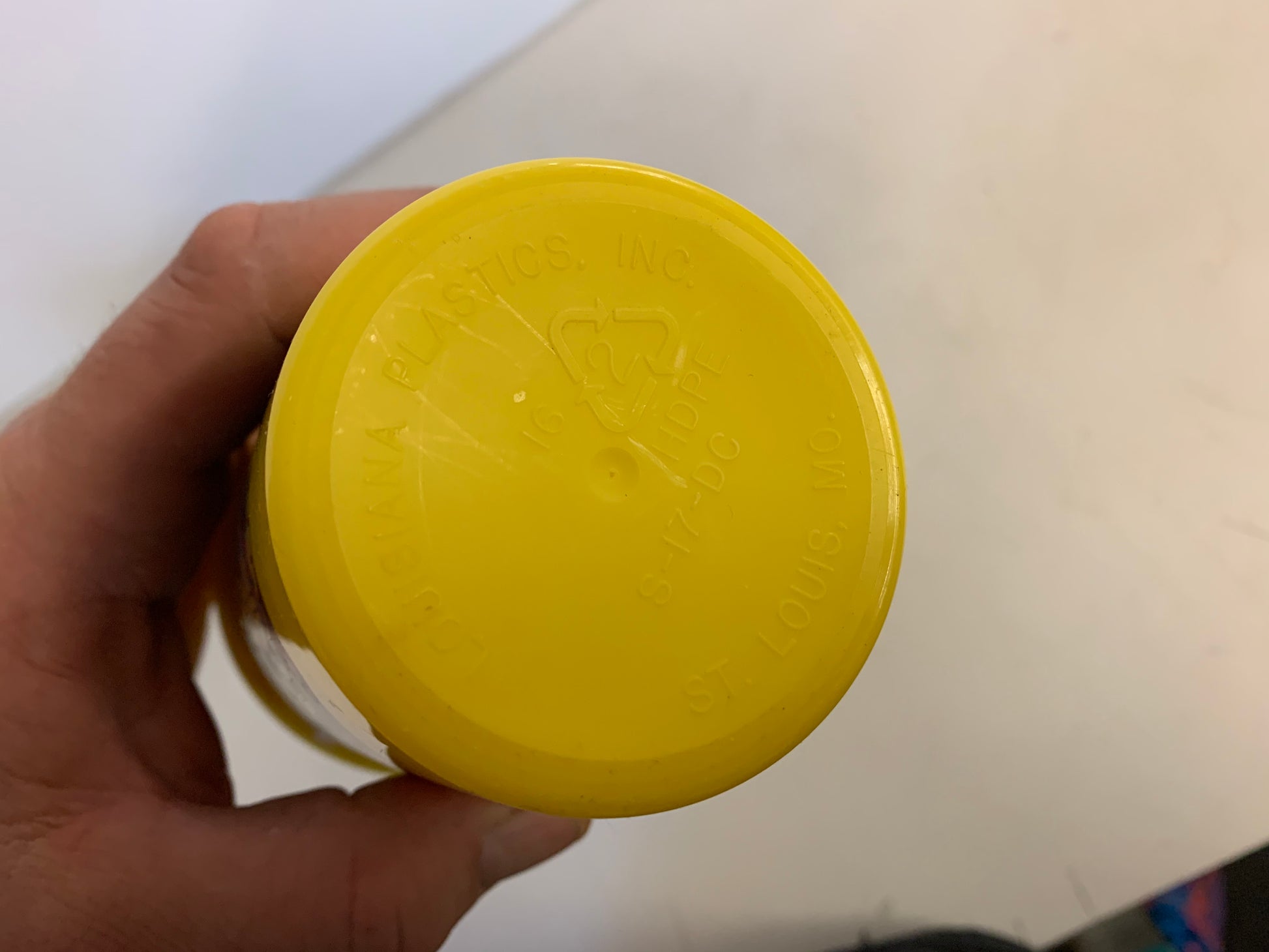 Here is a very 90's drink cup in yellow from Louisiana Plastics, featuring Hershey's Chocolate Syrup in a music videoesque pattern of numbers, checkerboards, floating lips, musical notes, crazy clock and "extreme" layout with a very happy cup of milk receiving a Hershey's fill-up. The cup is approximately 4.5" tall, with a 3" wide mouth and would hold about 12 oz. The perfect vessel for those chocolate milk treats or other party drinks, in a shiny 90's package.