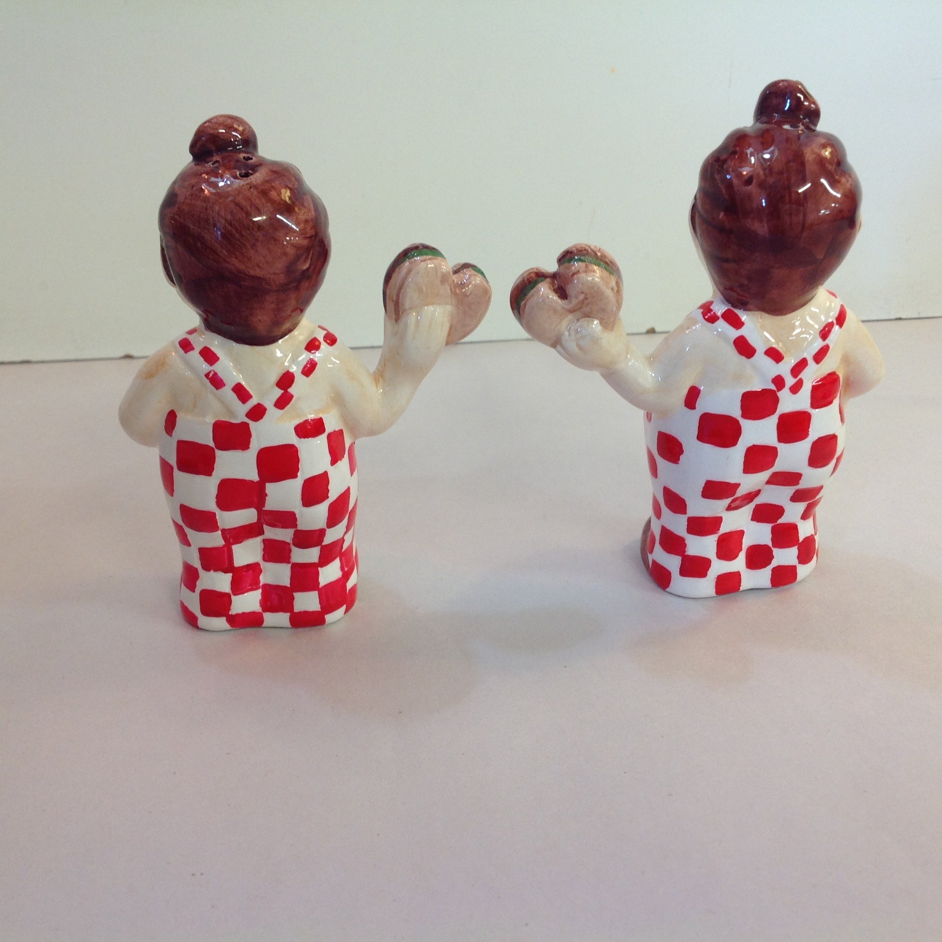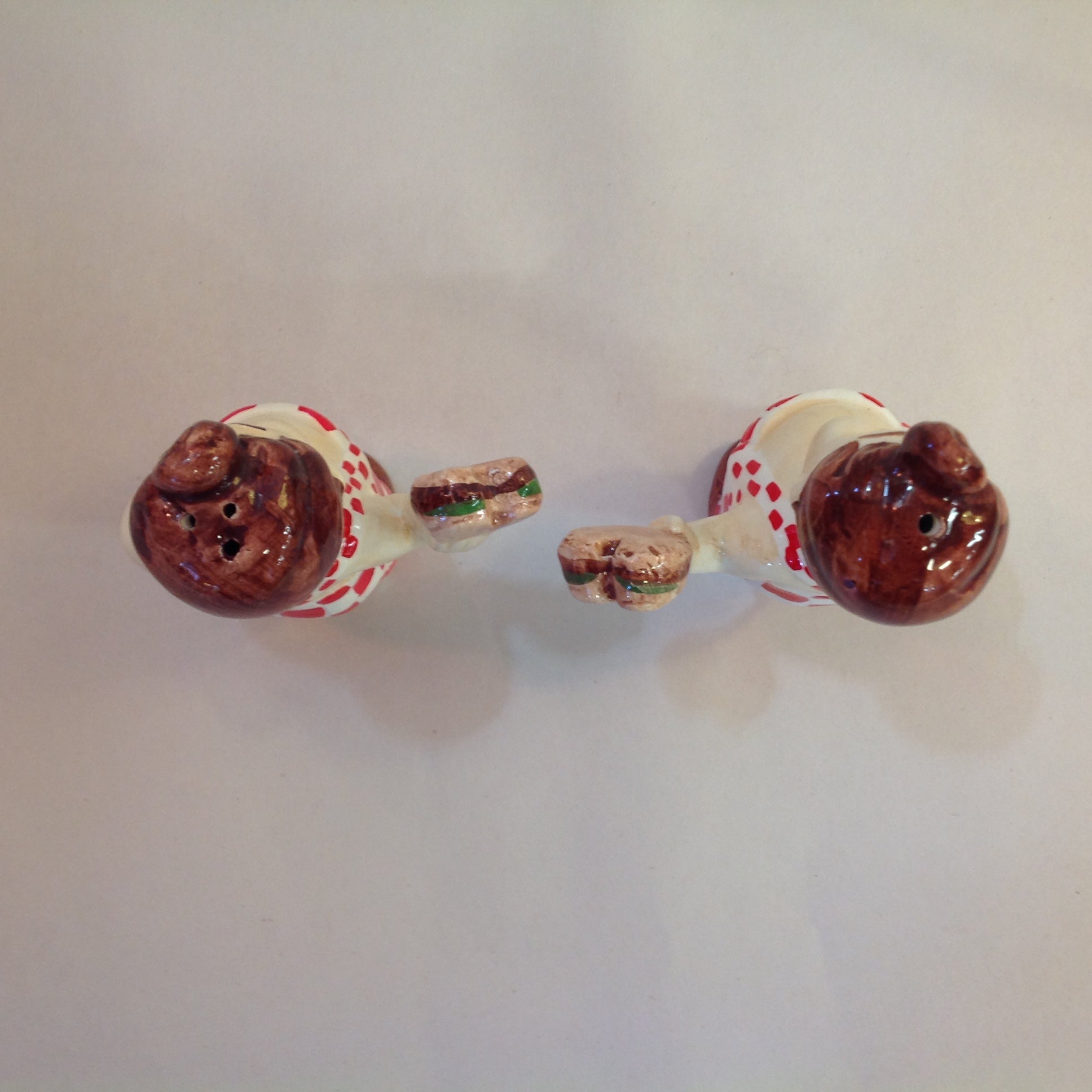 These are vintage N(ew) O(ld) S(tock) items, in good NOS condition, with little sign of age/wear; there is mild rubbing to surface of porcelain. Overall quality is good; smooth/glossy, with excellent preservation of color/sheen and figural embellishments still sharp/clear; stoppers remain intact. There are no excessive nicks, chips, dents, divots, scrapes, scratches, scuffs, cracks, breaks, stains, residue or repairs. Each shaker measures approx 4" x 3" and is stamped "Made in China."