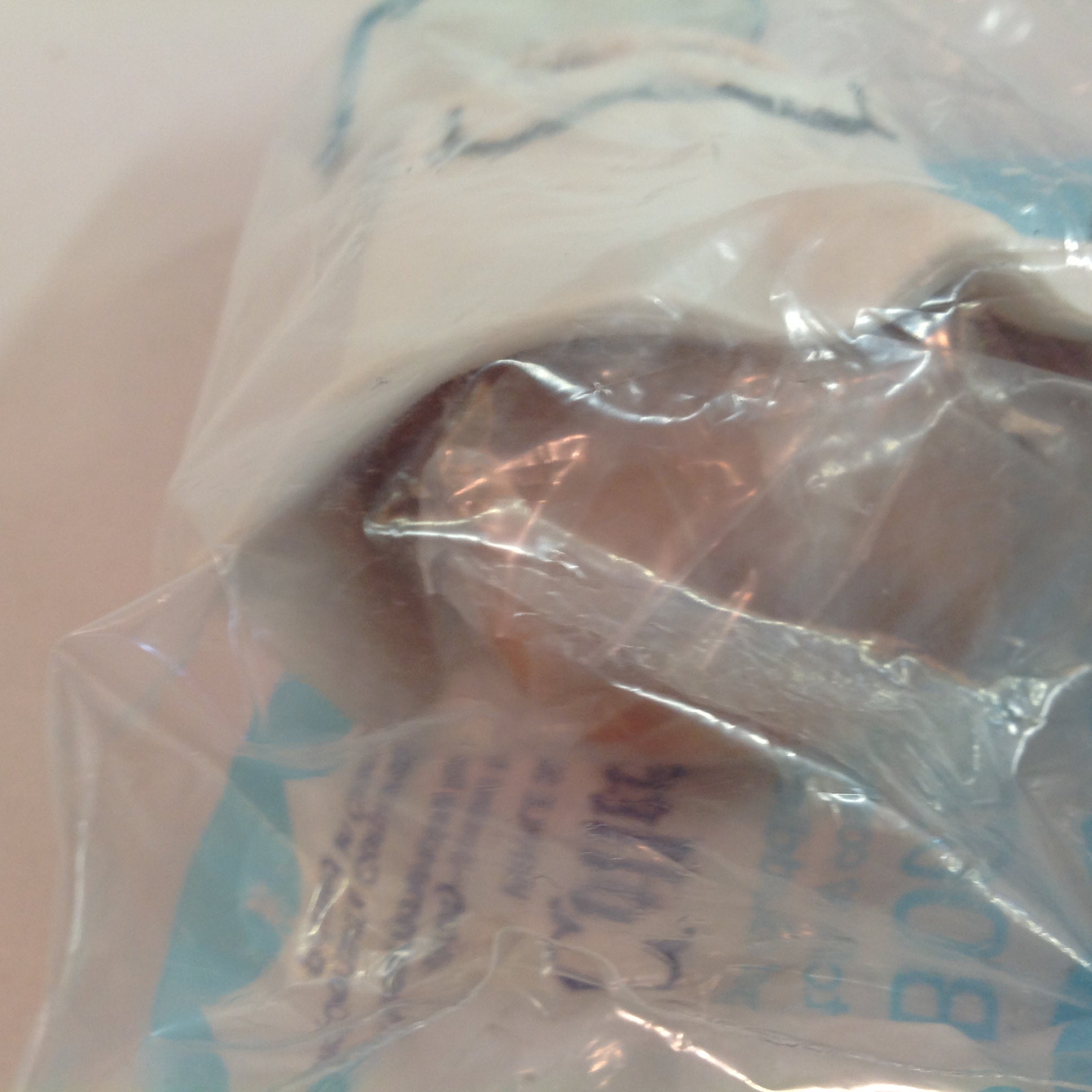 This is a vintage N(ew) O(ld) S(tock) item, in good NOS condition, with light signs of age/wear; the toy is still in its original bag, which has not been opened, and shows mild rubbing to surface of bag, minor points of blemish/distress. Interior toy appears unused; clean, smooth/glossy, with excellent preservation of color/sheen and figural embellishments still sharp/clear. There are no excessive nicks, chips, dents, divots, scrapes, scratches, scuffs, cracks, breaks, stains, residue or repairs. The toy in bag measures approx 4.5" x 5".