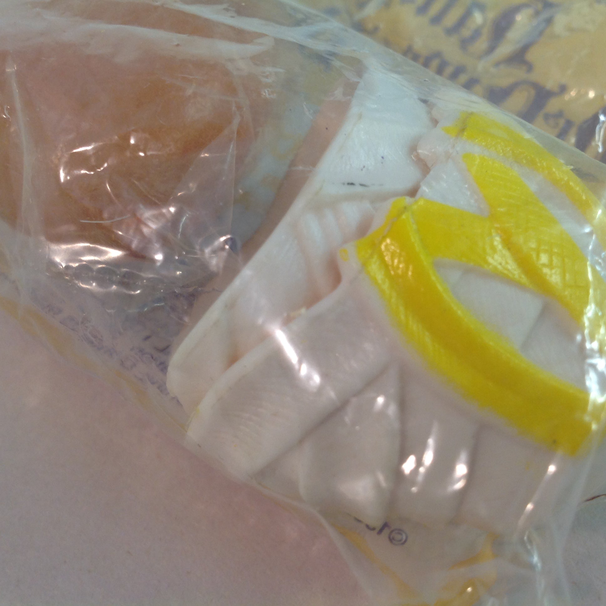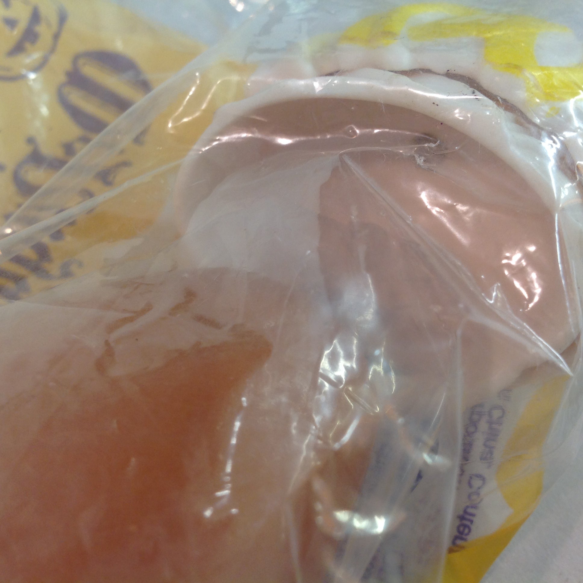 This is a vintage N(ew) O(ld) S(tock) item, in good NOS condition, with light signs of age/wear; the toy is still in its original bag, which has not been opened, and shows mild rubbing to surface of bag, minor points of blemish/distress. Interior toy appears unused; clean, smooth/glossy, with excellent preservation of color/sheen and figural embellishments still sharp/clear. There are no excessive nicks, chips, dents, divots, scrapes, scratches, scuffs, cracks, breaks, stains, residue or repairs. The toy in bag measures approx 4.5" x 5".