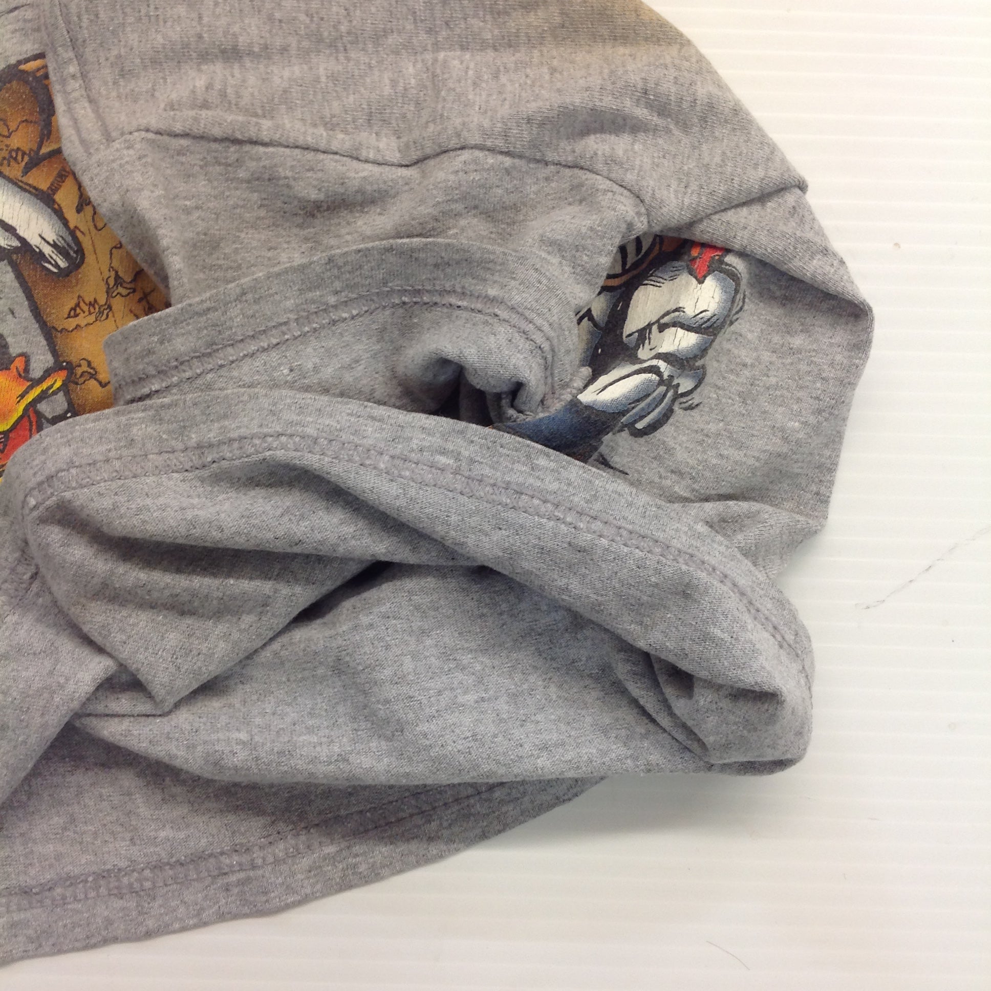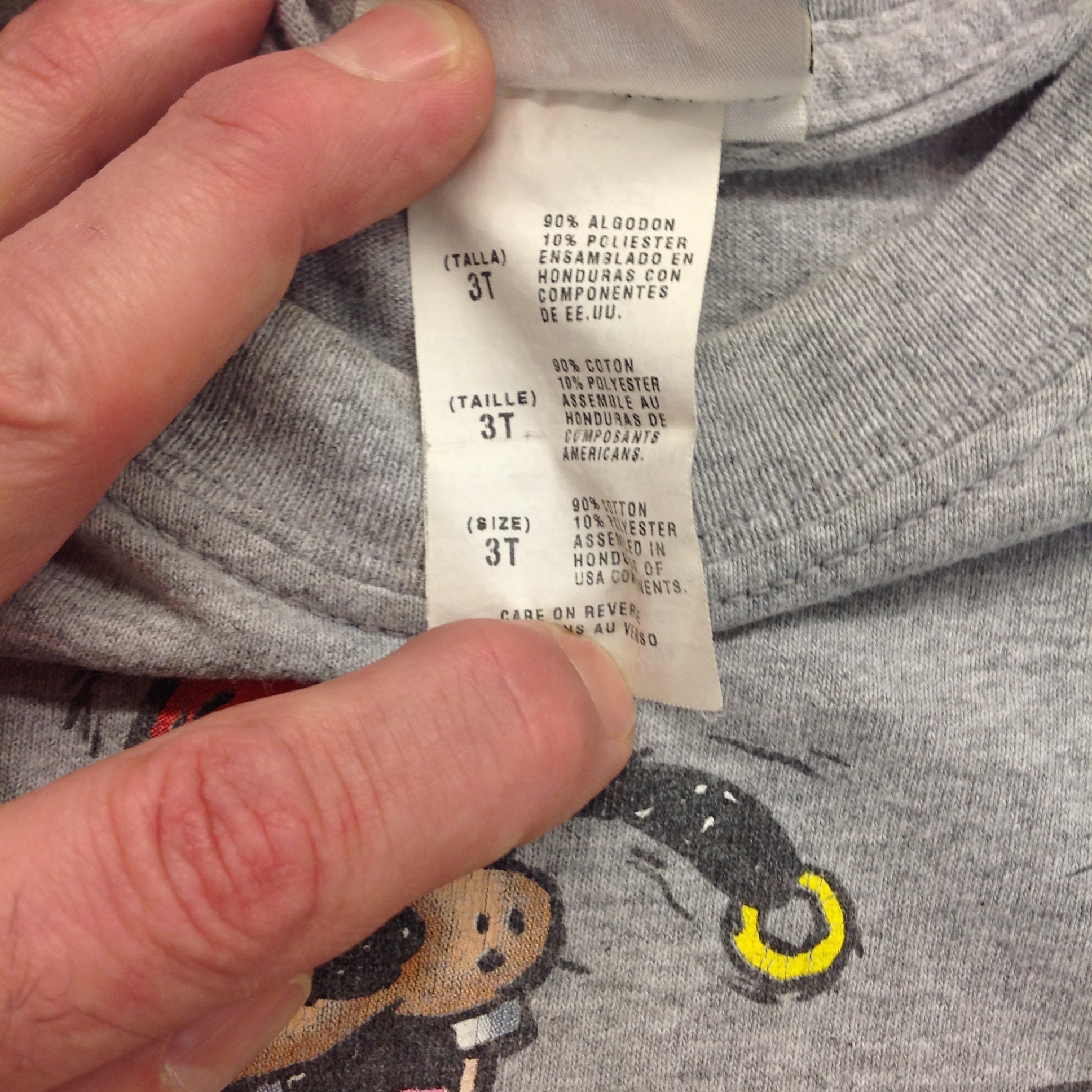 This is a vintage used item, in good used condition, with light signs of age/wear; there is mild rubbing to surface of fabric, light wear along cuffs and hems, some wear to manufacturer tag, faint wear to graphics. Overall fabric quality is good; clean/smooth, soft/supple, with excellent preservation of color/sheen and graphics still bold/clear. There are no excessive nicks, rips, tears, perforations, stains, residue or repairs. The shirt is tagged as a "3T" of 90/10 polycotton and is made in Honduras. Overall shirt measurements are approx: Shoulder-to-Shoulder: 13" Shoulder-to-Sleeve: 5", Chest: 26" Overall length: 16".