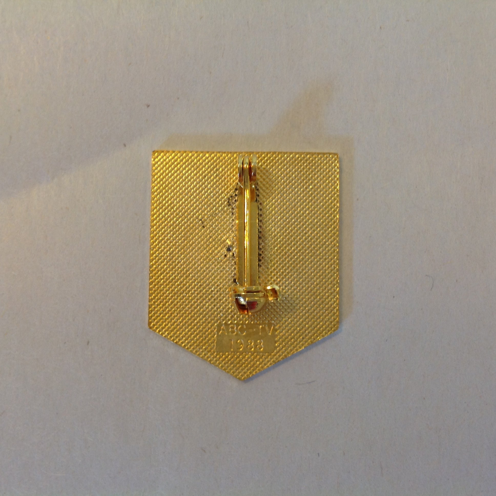 This is a vintage used item, in good used condition, with light signs of age/wear; there is mild rubbing to surface of pin, mild wear along/about rear face. Overall quality is good; clean, smooth/glossy, with excellent preservation of color/sheen and graphics still bold/vivid. There are no excessive nicks, chips, dents, divots, scrapes, scratches, scuffs, cracks, breaks, stains, residue or repairs.